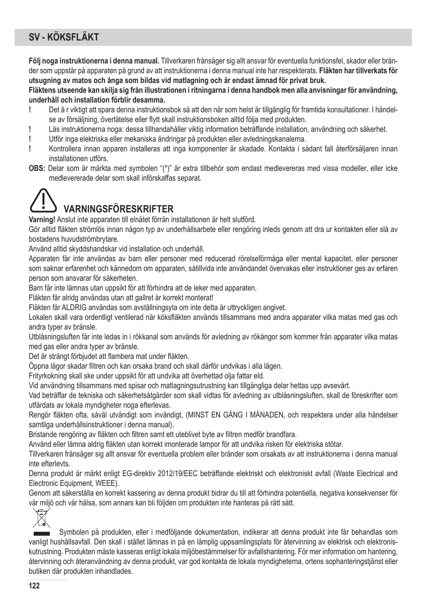 Les enfants doivent être surveillés afin qu’ils ne jouent pas avec l’appareil. Ne jamais utiliser la hotte sans que la grille ne soit montée correctement! La hotte ne doit JAMAIS être utilisée comme plan pour déposer quelque chose sauf si cela est expressément indiqué. Quand la hotte est utilisée en même temps que d’autres appareils à combustion de gaz ou d’autres combustibles, le local doit disposer d’une ventilation suffisante. L’air aspiré ne doit jamais être envoyé dans un conduit utilisé pour l’évacuation des fumées produites par des appareils à combustion de gaz ou d’autres combustibles. Il est formellement interdit de faire flamber les aliments sous la hotte. L’utilisation de flammes libres peut entraîner des dégâts aux filtres et peut donner lieu à des incendies, il faut donc les éviter à tout prix. La friture d’aliments doit être réalisée sous contrôle pour éviter que l’huile surchauffée ne prenne feu. Les pièces accessibles peuvent se réchauffer de façon importante quand elles sont utilisées avec des appareils pour la cuisson. En ce qui concerne les mesures techniques et de sécurité à adopter pour l’évacuation des fumées, s’en tenir strictement à ce qui est prévu dans les règlements des autorités locales compétentes. La hotte doit être régulièrement nettoyée, aussi bien à l’intérieur qu’à l’extérieur (AU MOINS UNE FOIS PAR MOIS, respecter néanmoins les instructions relatives à l’entretien fournies dans ce manuel). La non observation de ces normes de nettoyage de la hotte et du changement et nettoyage des filtres comporte des risques d’incendie. Ne pas utiliser ou laisser la hotte sans que les ampoules soient correctement placées pour éviter tout risque de choc électrique. La société décline toute responsabilité pour d’éventuels inconvénients, dégâts ou incendies provoqués par l’appareil et 43