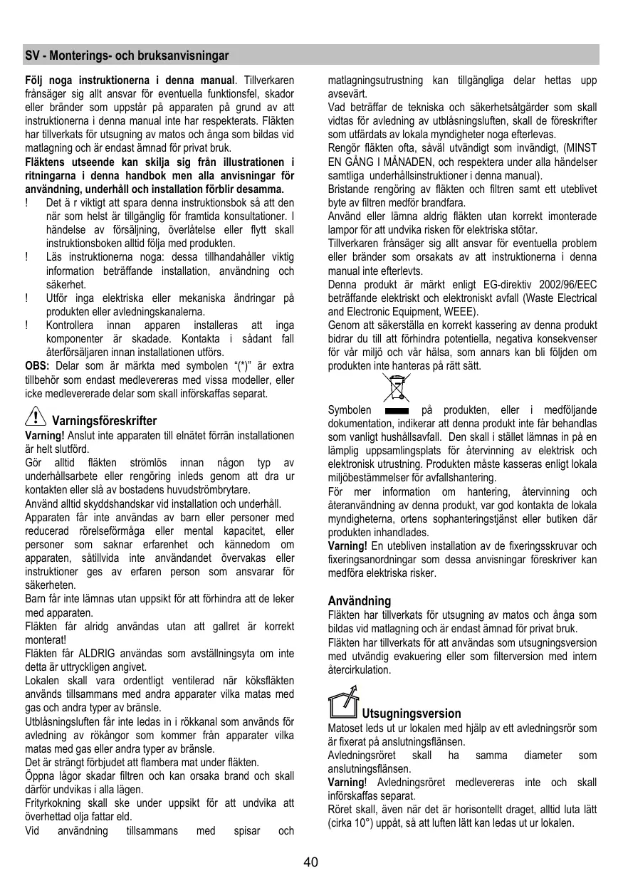 éviter à tout prix. La friture d’aliments doit être réalisée sous contrôle pour éviter que l’huile surchauffée ne prenne feu. Les pièces accessibles peuvent se réchauffer de façon importante quand elles sont utilisées avec des appareils pour la cuisson. En ce qui concerne les mesures techniques et de sécurité à adopter pour l’évacuation des fumées, s’en tenir strictement à ce qui est prévu dans les règlements des autorités locales compétentes. La hotte doit être régulièrement nettoyée, aussi bien à l’intérieur qu’à l’extérieur (AU MOINS UNE FOIS PAR MOIS, respecter néanmoins les instructions relatives à l’entretien fournies dans ce manuel). La non observation de ces normes de nettoyage de la hotte et du changement et nettoyage des filtres comporte des risques d’incendie. Ne pas utiliser ou laisser la hotte sans que les ampoules soient correctement placées pour éviter tout risque de choc électrique. La société décline toute responsabilité pour d’éventuels inconvénients, dégâts ou incendies provoqués par l’appareil et dérivés de la non observation des instructions reprises dans ce manuel. Cet appareil porte le symbole du recyclage conformément à la Directive Européenne 2002/96/CE concernant les Déchets d’Équipements Électriques et Électroniques (DEEE ou WEEE). En procédant correctement à la mise au rebut de cet appareil, vous contribuerez à empêcher toute conséquence nuisible pour l’environnement et la santé de l’homme.