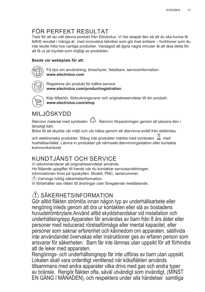 Vi rekommenderar att originalreservdelar används. Ha följande uppgifter till hands när du kontaktar serviceavdelningen. Informationen finns på typskylten. Modell, PNC, serienummer. Varnings-/viktig säkerhetsinformation. Vi förbehåller oss rätten till ändringar utan föregående meddelande. SÄKERHETSINFORMATION Gör alltid fläkten strömlös innan någon typ av underhållsarbete eller rengöring inleds genom att dra ur kontakten eller slå av bostadens huvudströmbrytare.Använd alltid skyddshandskar vid installation och underhållsingrepp.Apparaten får användas av barn från 8 års ålder eller personer med reducerad rörelseförmåga eller mental kapacitet, eller personer som saknar erfarenhet och kännedom om apparaten, såtillvida inte användandet övervakas eller instruktioner ges av erfaren person som ansvarar för säkerheten. Barn får inte lämnas utan uppsikt för att förhindra att de leker med apparaten. Rengörings- och underhållsingrepp får inte utföras av barn utan uppsikt. Lokalen skall vara ordentligt ventilerad när köksfläkten används tillsammans med andra apparater vilka drivs med gas och andra typer av bränsle. Rengör fläkten ofta, såväl utvändigt som invändigt, (MINST EN GÅNG I MÅNADEN), och respektera under alla händelser samtliga