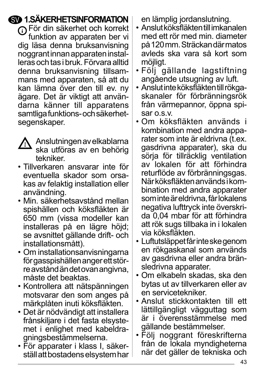 • Pour les appareils de Classe I, s’assurer que l’installation électrique de votre intérieur dispose d’une mise à la terre adéquate. Reliez l’aspirateur du conduit de cheminée avec un tube ayant un diamètre minimum de 120 mm. Le parcours des fumées doit être le plus court possible. Respecter toutes les normes concernant l’évacuation de l’air. Ne reliez pas la hotte aspirante aux conduits de cheminée qui acheminent les fumées de combustion (par ex. de chaudières, de cheminées, etc.). Si vous utilisez l’aspirateur en même temps que des appareils non électriques (par ex. fonctionnant au gaz), veillez à ce que la pièce soit adéquatement ventilée, afin d’empêcher le retour du flux des gaz d’évacuation. Si vous utilisez la hotte de cuisine en même temps que des appareils non alimentés à l’électricité, la pression négative dans la pièce ne doit pas dépasser 0,04 mbar, afin d’éviter que les fumées soient réaspirées dans la pièce où se trouve la hotte. Ne pas évacuer l’air à travers 15