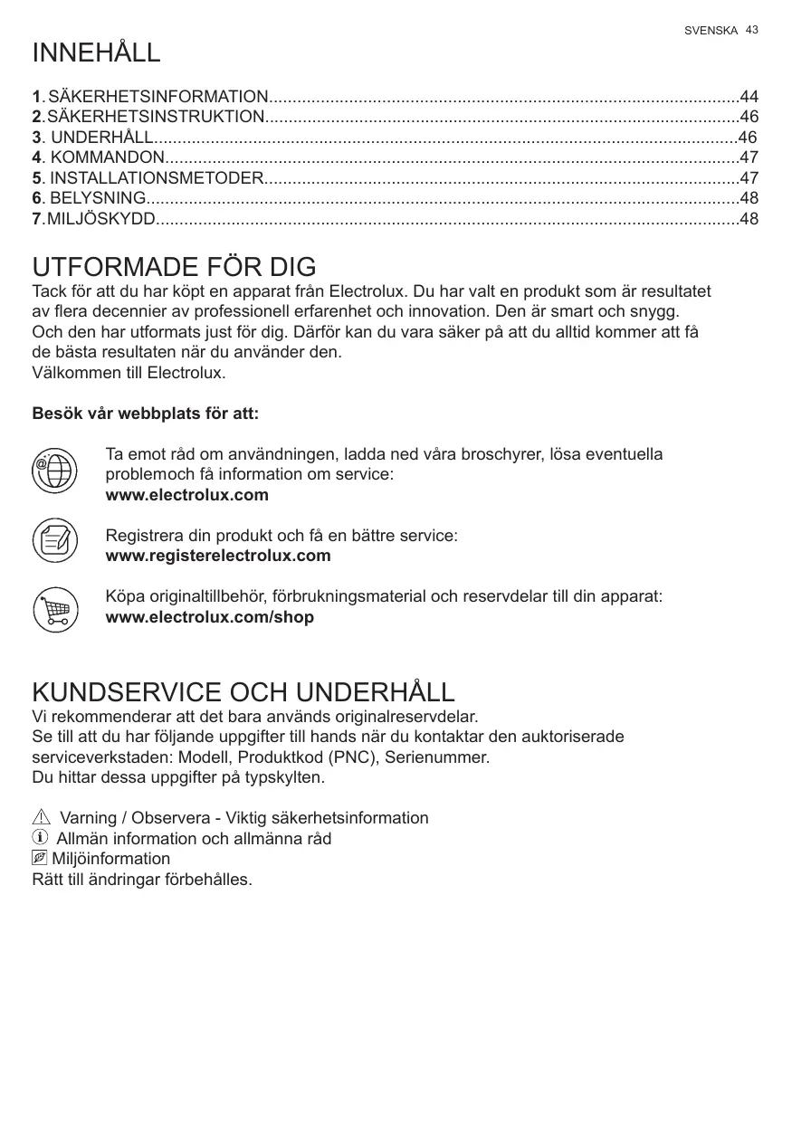 Vi rekommenderar att det bara används originalreservdelar. Se till att du har följande uppgifter till hands när du kontaktar den auktoriserade serviceverkstaden: Modell, Produktkod (PNC), Serienummer. Du hittar dessa uppgifter på typskylten. Varning / Observera - Viktig säkerhetsinformation Allmän information och allmänna råd Miljöinformation Rätt till ändringar förbehålles.
