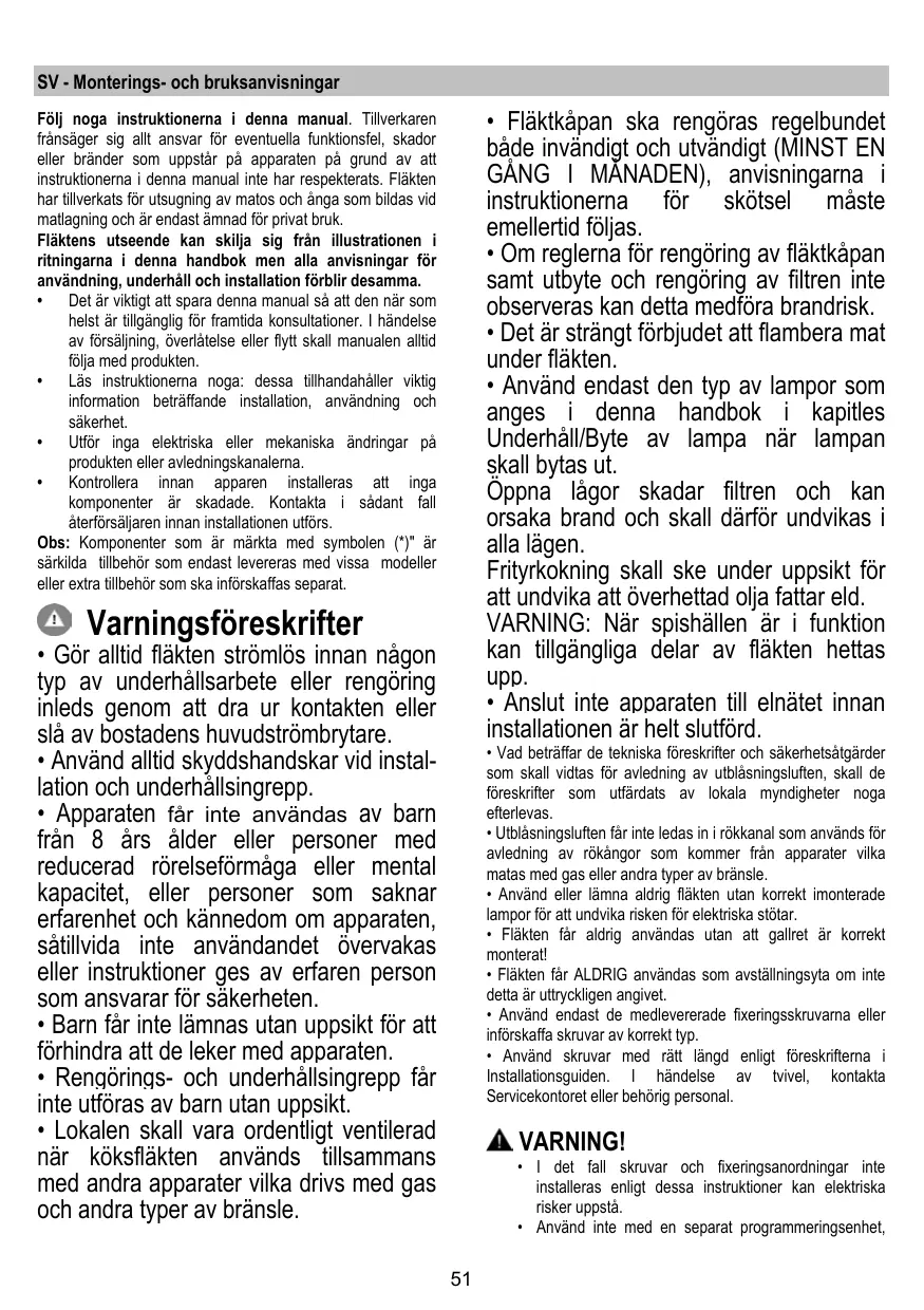 - Anslut inte apparaten till elnätet innan installationen är helt slutförd. Följ noga instruktionerna i denna manual. Tillverkaren frånsäger sig allt ansvar för eventuella funktionsfel, skador eller bränder som uppstår på apparaten på grund av att instruktionerna i denna manual inte har respekterats. Fläkten har tillverkats för utsugning av matos och ånga som bildas vid matlagning och är endast ämnad för privat bruk. Fläktens utseende kan skilja sig från illustrationen i ritningarna i denna handbok men alla anvisningar för användning, underhåll och installation förblir desamma.