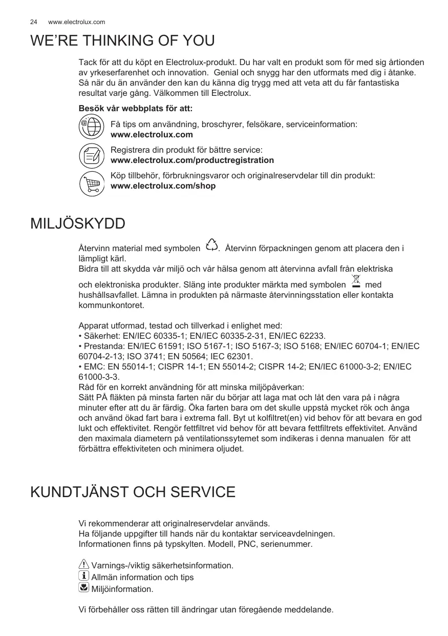 Tack för att du köpt en Electrolux-produkt. Du har valt en produkt som för med sig årtionden av yrkeserfarenhet och innovation. Genial och snygg har den utformats med dig i åtanke. Så när du än använder den kan du känna dig trygg med att veta att du får fantastiska resultat varje gång. Välkommen till Electrolux. Besök vår webbplats för att: Få tips om användning, broschyrer, felsökare, serviceinformation: www.electrolux.com Registrera din produkt för bättre service: www.electrolux.com/productregistration Köp tillbehör, förbrukningsvaror och originalreservdelar till din produkt: www.electrolux.com/shop MILJÖSKYDD Återvinn material med symbolen . Återvinn förpackningen genom att placera den i lämpligt kärl. Bidra till att skydda vår miljö och vår hälsa genom att återvinna avfall från elektriska och elektroniska produkter. Släng inte produkter märkta med symbolen med hushållsavfallet. Lämna in produkten på närmaste återvinningsstation eller kontakta kommunkontoret. Apparat utformad, testad och tillverkad i enlighet med: