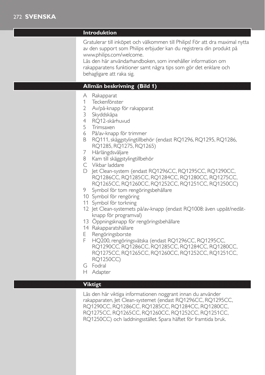 Rakapparat Teckenfönster Av/på-knapp för rakapparat Skyddskåpa RQ12-skärhuvud Trimsaxen På/av-knapp för trimmer RQ111, skäggstylingtillbehör (endast RQ1296, RQ1295, RQ1286, RQ1285, RQ1275, RQ1265) Hårlängdsväljare Kam till skäggstylingtillbehör Vikbar laddare Jet Clean-system (endast RQ1296CC, RQ1295CC, RQ1290CC, RQ1286CC, RQ1285CC, RQ1284CC, RQ1280CC, RQ1275CC, RQ1265CC, RQ1260CC, RQ1252CC, RQ1251CC, RQ1250CC) Symbol för tom rengöringsbehållare Symbol för rengöring Symbol för torkning Jet Clean-systemets på/av-knapp (endast RQ1008: även uppåt/nedåtknapp för programval) Öppningsknapp för rengöringsbehållare Rakapparatshållare Rengöringsborste HQ200, rengöringsvätska (endast RQ1296CC, RQ1295CC, RQ1290CC, RQ1286CC, RQ1285CC, RQ1284CC, RQ1280CC, RQ1275CC, RQ1265CC, RQ1260CC, RQ1252CC, RQ1251CC, RQ1250CC) Fodral Adapter Viktigt Läs den här viktiga informationen noggrant innan du använder rakapparaten, Jet Clean-systemet (endast RQ1296CC, RQ1295CC, RQ1290CC, RQ1286CC, RQ1285CC, RQ1284CC, RQ1280CC, RQ1275CC, RQ1265CC, RQ1260CC, RQ1252CC, RQ1251CC, RQ1250CC) och laddningsstället. Spara häftet för framtida bruk. SVENSKA 273 Fara -- Blöt inte ned adaptern. Varning -- Adaptern innehåller en transformator. Byt inte ut adaptern mot någon annan typ av kontakt, eftersom det kan orsaka fara. -- Rakapparaten, Jet Clean-systemet och laddningsstället är endast avsedda för användning av personer (inklusive barn) med olika funktionsnedsättningar, eller av personer som inte har kunskap om hur den används, om de får assistans eller instruktioner för användning av apparaten av en person som är ansvarig för deras säkerhet. -- Se till att barn är under överinseende av en vuxen så att de inte leker med rakapparaten, Jet Clean-systemet eller laddningsstället. -- Dra alltid ur rakapparatens stickpropp innan du rengör den under rinnande vatten. Försiktighet -- Sänk aldrig ned Jet Clean-systemet eller laddningsstället i vatten, och skölj det inte under kranen. -- Använd aldrig vatten som är varmare än 80 °C när du sköljer rakapparaten. -- Använd inte rakapparaten, Jet Clean-systemet, adaptern, laddningsstället eller övriga delar om de är skadade, eftersom det kan orsaka personskador. Byt alltid ut en skadad del mot en originaldel. -- Använd endast Jet Clean-systemet med den ursprungliga Jet Cleanlösningen HQ200. -- Ställ alltid Jet Clean-systemet på en stabil, plan och horisontell yta, så förhindrar du läckage. -- Flytta inte Jet Clean-systemet när det är klart för användning. Då kan rengöringsvätska läcka ut. -- Jet Clean-systemet rengör rakapparaten grundligt, men den desinficeras inte. Dela den därför inte med andra. -- Använd aldrig tryckluft, skursvampar, slipande rengöringsmedel eller vätskor som bensin eller aceton till att rengöra enheten. -- Det kan rinna vatten från uttaget nedtill på rakapparaten när du sköljer den. Det är normalt och inte farligt, eftersom all elektronik är inkapslad i en försluten strömenhet inuti rakapparaten. Överensstämmelse med standarder -- Den här rakapparaten är vattentät och uppfyller internationellt godkända säkerhetsföreskrifter. Den kan användas både i badkaret och i duschen samt under kranen. Av säkerhetsskäl kan rakapparaten därför endast användas utan sladd. -- Rakapparaten och Jet Clean-systemet uppfyller alla tillämpliga standarder och regler gällande exponering av elektromagnetiska fält. Allmänt -- Adaptern är utrustad med en automatisk spänningsväljare och är avsedd för nätspänningar från 100 till 240 V. -- Adaptern omvandlar 100–240 V till en säker låg spänning på under 24 V. -- Max ljudnivå: Lc = 69 dB(A) SVENSKA Teckenfönstret MINUTES LEFT MINUTES LEFT Obs! Innan du använder rakapparaten första gången ska du ta bort skyddsfilmen från teckenfönstret. De olika rakapparatsmodellerna har olika teckenfönster som visas på bilderna nedan. -- RQ1296, RQ1295, RQ1290, RQ1286, RQ1285, RQ1280 -- RQ1275, RQ1265, RQ1261, RQ1260 -- RQ1273, RQ1252, RQ1251, RQ1250 Laddning -- Laddningen tar ungefär 1 timme. MINUTES LEFT