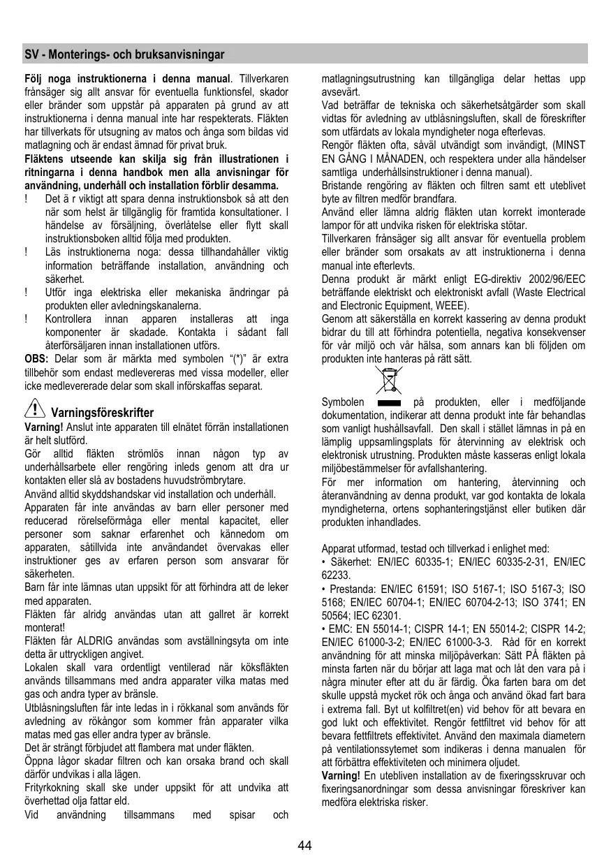 SV - Monterings- och bruksanvisningar Följ noga instruktionerna i denna manual. Tillverkaren frånsäger sig allt ansvar för eventuella funktionsfel, skador eller bränder som uppstår på apparaten på grund av att instruktionerna i denna manual inte har respekterats. Fläkten har tillverkats för utsugning av matos och ånga som bildas vid matlagning och är endast ämnad för privat bruk. Fläktens utseende kan skilja sig från illustrationen i ritningarna i denna handbok men alla anvisningar för användning, underhåll och installation förblir desamma. Det ä r viktigt att spara denna instruktionsbok så att den när som helst är tillgänglig för framtida konsultationer. I händelse av försäljning, överlåtelse eller flytt skall instruktionsboken alltid följa med produkten. Läs instruktionerna noga: dessa tillhandahåller viktig information beträffande installation, användning och säkerhet. Utför inga elektriska eller mekaniska ändringar på produkten eller avledningskanalerna. Kontrollera innan apparen installeras att inga komponenter är skadade. Kontakta i sådant fall återförsäljaren innan installationen utförs. OBS: Delar som är märkta med symbolen “(*)” är extra tillbehör som endast medlevereras med vissa modeller, eller icke medlevererade delar som skall införskaffas separat. matlagningsutrustning kan tillgängliga delar hettas upp avsevärt. Vad beträffar de tekniska och säkerhetsåtgärder som skall vidtas för avledning av utblåsningsluften, skall de föreskrifter som utfärdats av lokala myndigheter noga efterlevas. Rengör fläkten ofta, såväl utvändigt som invändigt, (MINST EN GÅNG I MÅNADEN, och respektera under alla händelser samtliga underhållsinstruktioner i denna manual). Bristande rengöring av fläkten och filtren samt ett uteblivet byte av filtren medför brandfara. Använd eller lämna aldrig fläkten utan korrekt imonterade lampor för att undvika risken för elektriska stötar. Tillverkaren frånsäger sig allt ansvar för eventuella problem eller bränder som orsakats av att instruktionerna i denna manual inte efterlevts. Denna produkt är märkt enligt EG-direktiv 2002/96/EEC beträffande elektriskt och elektroniskt avfall (Waste Electrical and Electronic Equipment, WEEE). Genom att säkerställa en korrekt kassering av denna produkt bidrar du till att förhindra potentiella, negativa konsekvenser för vår miljö och vår hälsa, som annars kan bli följden om produkten inte hanteras på rätt sätt. på produkten, eller i medföljande Symbolen dokumentation, indikerar att denna produkt inte får behandlas som vanligt hushållsavfall. Den skall i stället lämnas in på en lämplig uppsamlingsplats för återvinning av elektrisk och elektronisk utrustning. Produkten måste kasseras enligt lokala miljöbestämmelser för avfallshantering. För mer information om hantering, återvinning och återanvändning av denna produkt, var god kontakta de lokala myndigheterna, ortens sophanteringstjänst eller butiken där produkten inhandlades. Varningsföreskrifter Varning! Anslut inte apparaten till elnätet förrän installationen är helt slutförd. Gör alltid fläkten strömlös innan någon typ av underhållsarbete eller rengöring inleds genom att dra ur kontakten eller slå av bostadens huvudströmbrytare. Använd alltid skyddshandskar vid installation och underhåll. Apparaten får inte användas av barn eller personer med reducerad rörelseförmåga eller mental kapacitet, eller personer som saknar erfarenhet och kännedom om apparaten, såtillvida inte användandet övervakas eller instruktioner ges av erfaren person som ansvarar för säkerheten. Barn får inte lämnas utan uppsikt för att förhindra att de leker med apparaten. Fläkten får alridg användas utan att gallret är korrekt monterat! Fläkten får ALDRIG användas som avställningsyta om inte detta är uttryckligen angivet. Lokalen skall vara ordentligt ventilerad när köksfläkten används tillsammans med andra apparater vilka matas med gas och andra typer av bränsle. Utblåsningsluften får inte ledas in i rökkanal som används för avledning av rökångor som kommer från apparater vilka matas med gas eller andra typer av bränsle. Det är strängt förbjudet att flambera mat under fläkten. Öppna lågor skadar filtren och kan orsaka brand och skall därför undvikas i alla lägen. Frityrkokning skall ske under uppsikt för att undvika att överhettad olja fattar eld. Vid användning tillsammans med spisar och Apparat utformad, testad och tillverkad i enlighet med: