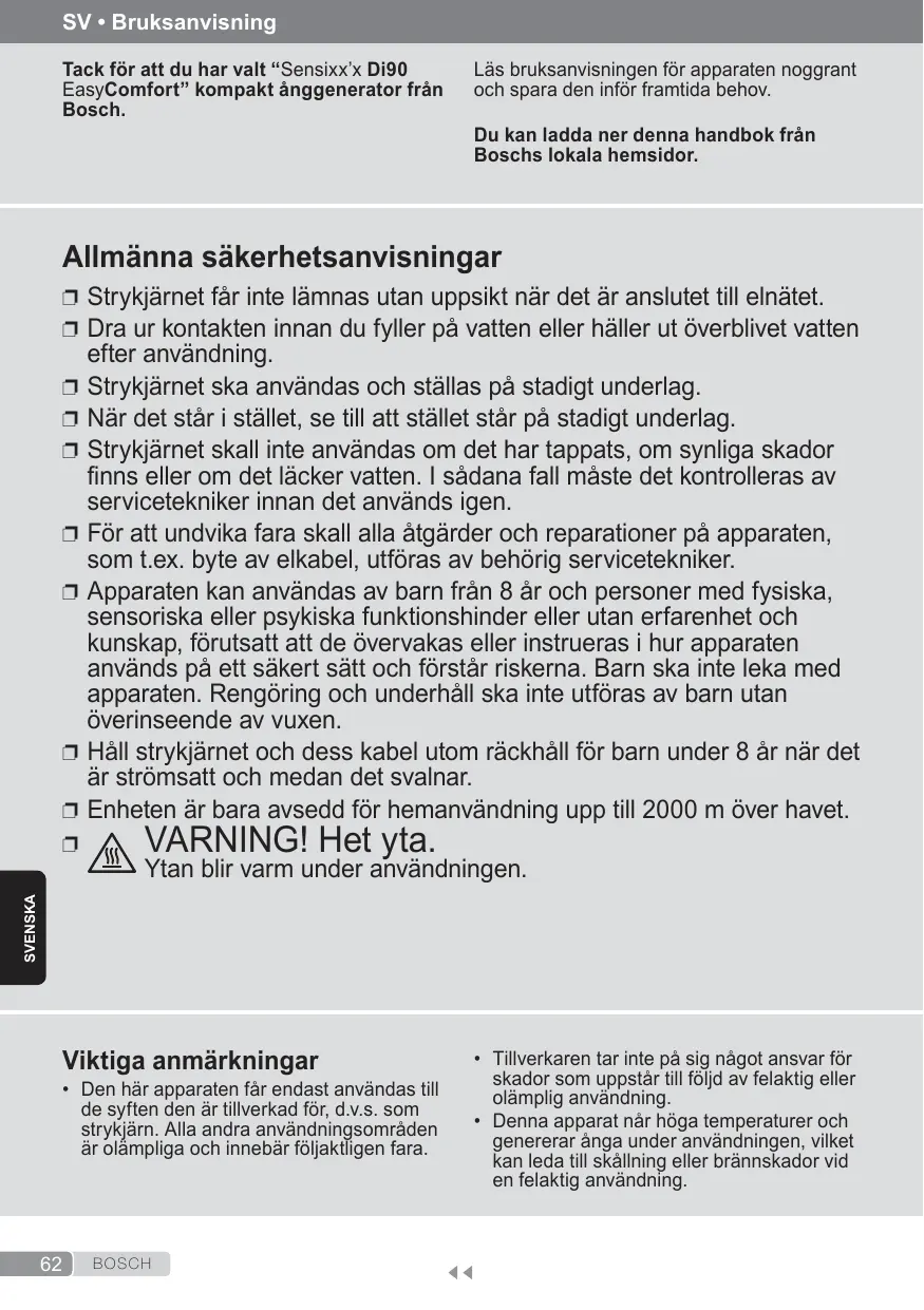 SV • Bruksanvisning Tack för att du har valt “Sensixx’x Di90 EasyComfort” kompakt ånggenerator från Bosch.