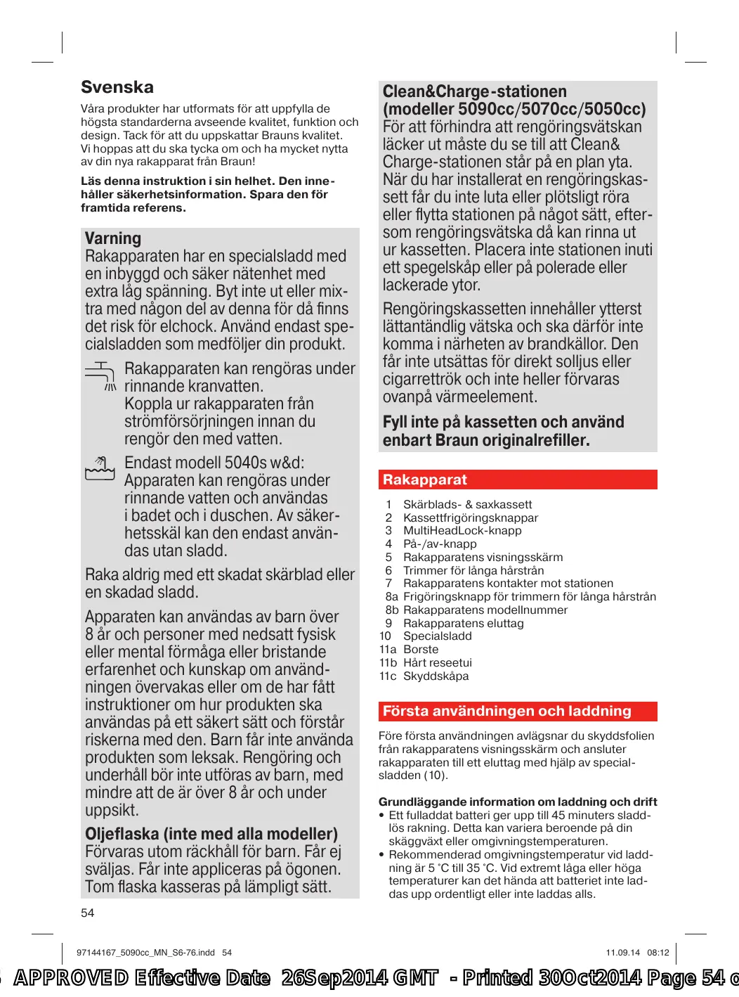 Clean&Charge-stationen (modeller 5090cc/5070cc/5050cc) För att förhindra att rengöringsvätskan läcker ut måste du se till att Clean& Charge-stationen står på en plan yta. När du har installerat en rengöringskassett får du inte luta eller plötsligt röra eller flytta stationen på något sätt, eftersom rengöringsvätska då kan rinna ut ur kassetten. Placera inte stationen inuti ett spegelskåp eller på polerade eller lackerade ytor. Rengöringskassetten innehåller ytterst lättantändlig vätska och ska därför inte komma i närheten av brandkällor. Den får inte utsättas för direkt solljus eller cigarrettrök och inte heller förvaras ovanpå värmeelement. Fyll inte på kassetten och använd enbart Braun originalrefiller. Rakapparat 1 2 3 4 5 6 7 8a 8b 9 10 11a 11b 11c
