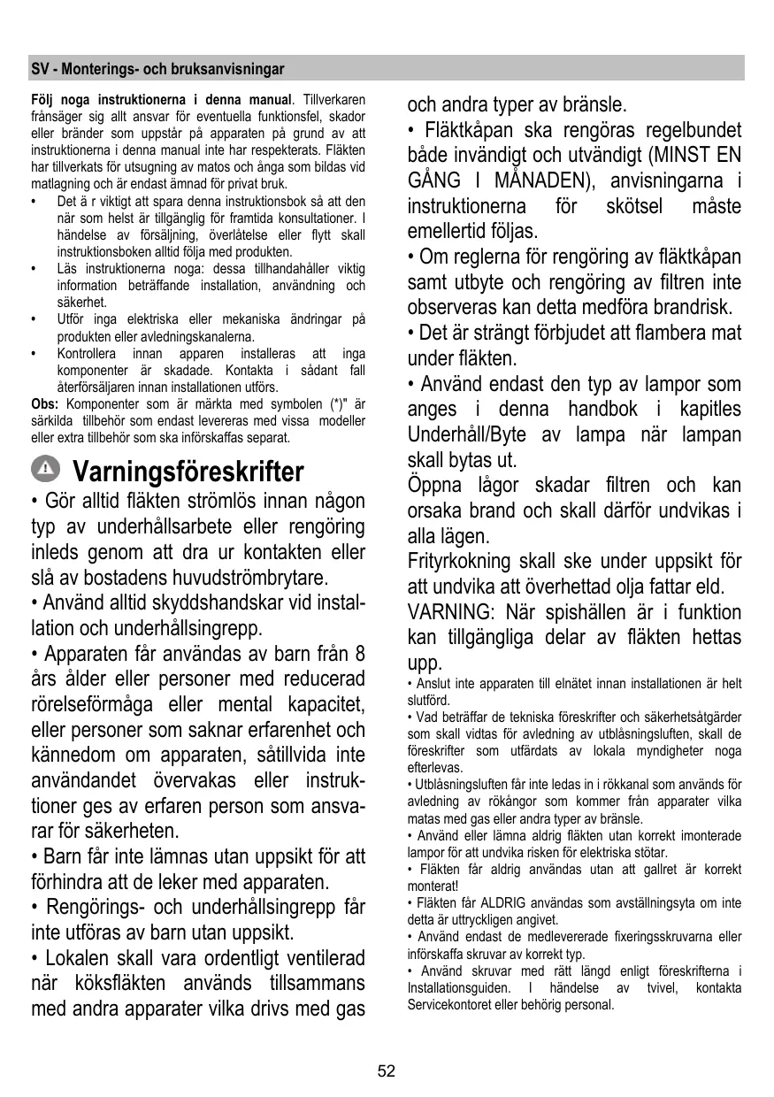 Varningsföreskrifter • Gör alltid fläkten strömlös innan någon typ av underhållsarbete eller rengöring inleds genom att dra ur kontakten eller slå av bostadens huvudströmbrytare. • Använd alltid skyddshandskar vid installation och underhållsingrepp. • Apparaten får användas av barn från 8 års ålder eller personer med reducerad rörelseförmåga eller mental kapacitet, eller personer som saknar erfarenhet och kännedom om apparaten, såtillvida inte användandet övervakas eller instruktioner ges av erfaren person som ansvarar för säkerheten. • Barn får inte lämnas utan uppsikt för att förhindra att de leker med apparaten. • Rengörings- och underhållsingrepp får inte utföras av barn utan uppsikt. • Lokalen skall vara ordentligt ventilerad när köksfläkten används tillsammans med andra apparater vilka drivs med gas