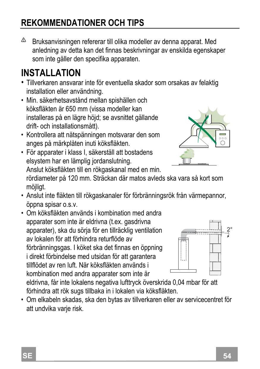 installation eller användning. Min. säkerhetsavstånd mellan spishällen och köksfläkten är 650 mm (vissa modeller kan installeras på en lägre höjd; se avsnittet gällande drift- och installationsmått). Kontrollera att nätspänningen motsvarar den som anges på märkplåten inuti köksfläkten. För apparater i klass I, säkerställ att bostadens elsystem har en lämplig jordanslutning. Anslut köksfläkten till en rökgaskanal med en min. rördiameter på 120 mm. Sträckan där matos avleds ska vara så kort som möjligt. Anslut inte fläkten till rökgaskanaler för förbränningsrök från värmepannor, öppna spisar o.s.v. Om köksfläkten används i kombination med andra apparater som inte är eldrivna (t.ex. gasdrivna apparater), ska du sörja för en tillräcklig ventilation av lokalen för att förhindra returflöde av förbränningsgas. I köket ska det finnas en öppning i direkt förbindelse med utsidan för att garantera tillflödet av ren luft. När köksfläkten används i kombination med andra apparater som inte är eldrivna, får inte lokalens negativa lufttryck överskrida 0,04 mbar för att förhindra att rök sugs tillbaka in i lokalen via köksfläkten. Om elkabeln skadas, ska den bytas av tillverkaren eller av servicecentret för att undvika varje risk.