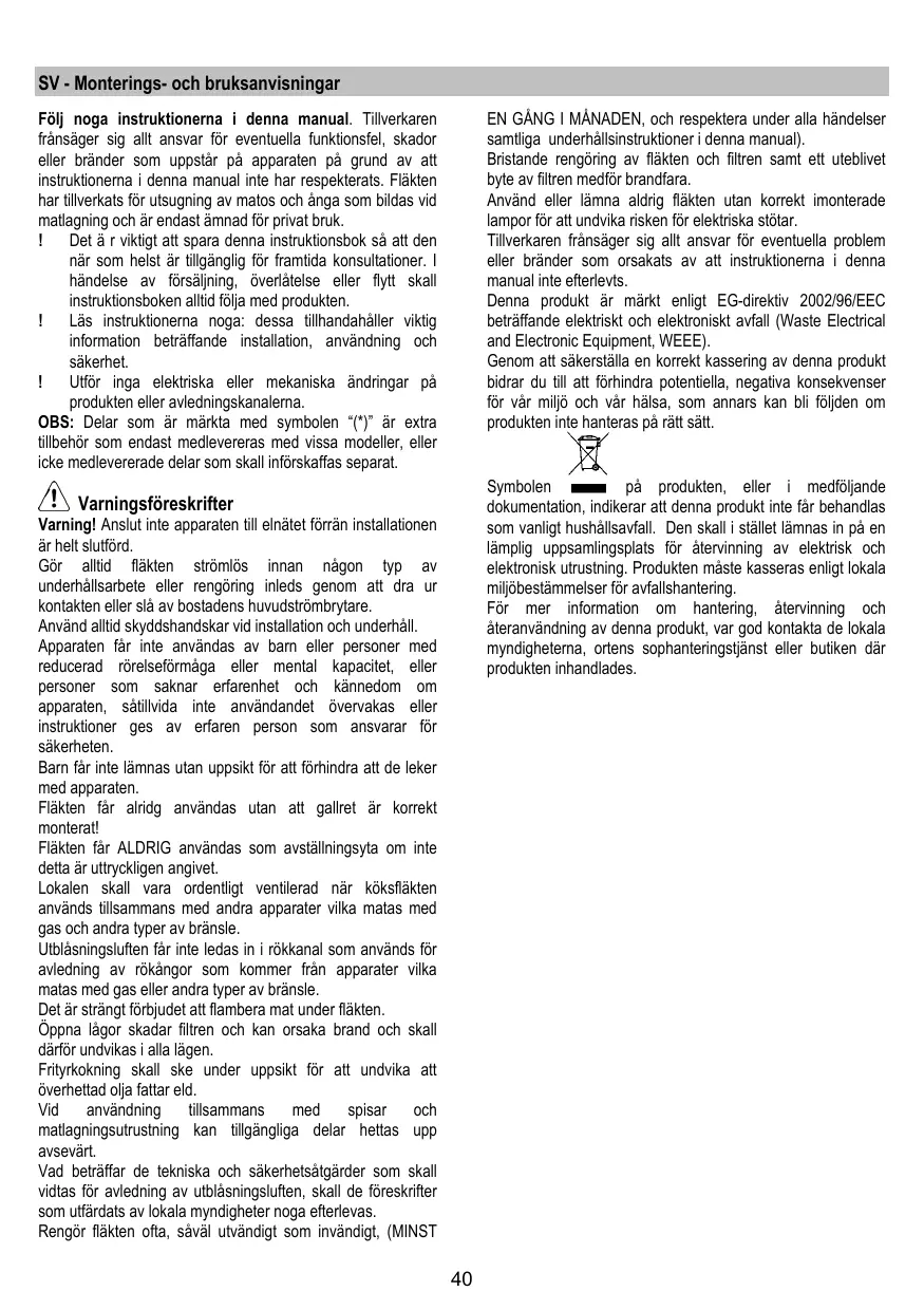 SV - Monterings- och bruksanvisningar EN GÅNG I MÅNADEN, och respektera under alla händelser samtliga underhållsinstruktioner i denna manual). Bristande rengöring av fläkten och filtren samt ett uteblivet byte av filtren medför brandfara. Använd eller lämna aldrig fläkten utan korrekt imonterade lampor för att undvika risken för elektriska stötar. Tillverkaren frånsäger sig allt ansvar för eventuella problem eller bränder som orsakats av att instruktionerna i denna manual inte efterlevts. Denna produkt är märkt enligt EG-direktiv 2002/96/EEC beträffande elektriskt och elektroniskt avfall (Waste Electrical and Electronic Equipment, WEEE). Genom att säkerställa en korrekt kassering av denna produkt bidrar du till att förhindra potentiella, negativa konsekvenser för vår miljö och vår hälsa, som annars kan bli följden om produkten inte hanteras på rätt sätt. Följ noga instruktionerna i denna manual. Tillverkaren frånsäger sig allt ansvar för eventuella funktionsfel, skador eller bränder som uppstår på apparaten på grund av att instruktionerna i denna manual inte har respekterats. Fläkten har tillverkats för utsugning av matos och ånga som bildas vid matlagning och är endast ämnad för privat bruk. Det ä r viktigt att spara denna instruktionsbok så att den när som helst är tillgänglig för framtida konsultationer. I händelse av försäljning, överlåtelse eller flytt skall instruktionsboken alltid följa med produkten. Läs instruktionerna noga: dessa tillhandahåller viktig information beträffande installation, användning och säkerhet. Utför inga elektriska eller mekaniska ändringar på produkten eller avledningskanalerna. OBS: Delar som är märkta med symbolen “(*)” är extra tillbehör som endast medlevereras med vissa modeller, eller icke medlevererade delar som skall införskaffas separat. Symbolen på produkten, eller i medföljande dokumentation, indikerar att denna produkt inte får behandlas som vanligt hushållsavfall. Den skall i stället lämnas in på en lämplig uppsamlingsplats för återvinning av elektrisk och elektronisk utrustning. Produkten måste kasseras enligt lokala miljöbestämmelser för avfallshantering. För mer information om hantering, återvinning och återanvändning av denna produkt, var god kontakta de lokala myndigheterna, ortens sophanteringstjänst eller butiken där produkten inhandlades. Varningsföreskrifter Varning! Anslut inte apparaten till elnätet förrän installationen är helt slutförd. Gör alltid fläkten strömlös innan någon typ av underhållsarbete eller rengöring inleds genom att dra ur kontakten eller slå av bostadens huvudströmbrytare. Använd alltid skyddshandskar vid installation och underhåll. Apparaten får inte användas av barn eller personer med reducerad rörelseförmåga eller mental kapacitet, eller personer som saknar erfarenhet och kännedom om apparaten, såtillvida inte användandet övervakas eller instruktioner ges av erfaren person som ansvarar för säkerheten. Barn får inte lämnas utan uppsikt för att förhindra att de leker med apparaten. Fläkten får alridg användas utan att gallret är korrekt monterat! Fläkten får ALDRIG användas som avställningsyta om inte detta är uttryckligen angivet. Lokalen skall vara ordentligt ventilerad när köksfläkten används tillsammans med andra apparater vilka matas med gas och andra typer av bränsle. Utblåsningsluften får inte ledas in i rökkanal som används för avledning av rökångor som kommer från apparater vilka matas med gas eller andra typer av bränsle. Det är strängt förbjudet att flambera mat under fläkten. Öppna lågor skadar filtren och kan orsaka brand och skall därför undvikas i alla lägen. Frityrkokning skall ske under uppsikt för att undvika att överhettad olja fattar eld. Vid användning tillsammans med spisar och matlagningsutrustning kan tillgängliga delar hettas upp avsevärt. Vad beträffar de tekniska och säkerhetsåtgärder som skall vidtas för avledning av utblåsningsluften, skall de föreskrifter som utfärdats av lokala myndigheter noga efterlevas. Rengör fläkten ofta, såväl utvändigt som invändigt, (MINST