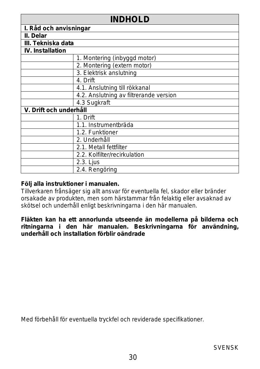 Fläkten kan ha att annorlunda utseendeän modellerna på bilderna och rittingarna i den har manualen. Beskrivningarna for användning, underhäll och installation Förblir oändrade