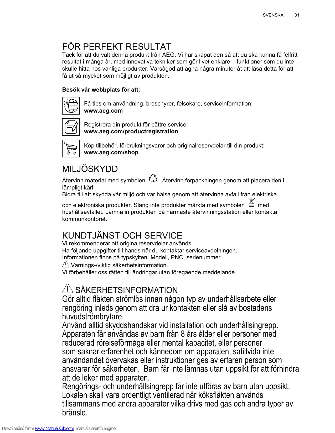 Avant toute opération de nettoyage ou d’entretien, débranchez l’alimentation électrique en retirant la fiche ou en coupant l’interrupteur général. Utilisez de gants de travail pour toute opération de nettoyage ou d’entretien. L’appareil peut être utilisé par les enfants âgés pas moins de 8 ans et les personnes ayant des capacités réduites physiques, sensorielles ou mentales, ou sans l’expérience ou les connaissances nécessaires, uniquement sous surveillance ou après ils ont reçu des instructions relatives à l’utilisation en sécurité de l’appareil et ont compris les dangers inhérents. Les enfants doivent être surveillés pour s’assurer qu’ils ne jouent pas avec l’appareil. Le nettoyage et l’entretien ne doivent pas être effectués par des enfants sans surveillance. La pièce doit avoir une aération suffisante lorsque la hotte est utilisée conjointement avec d’autres appareils fonctionnant au gaz ou autres combustibles. Downloaded from www.Manualslib.com manuals search engine