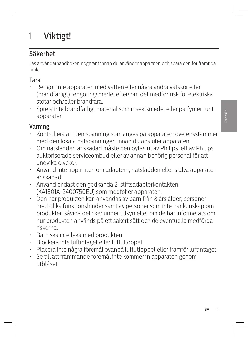 Avertissement • Avant de le brancher, vérifiez si la tension indiquée sur l'appareil correspond à la tension secteur locale. • Si le cordon d'alimentation est endommagé, il doit être remplacé par Philips, par un Centre Service Agréé Philips ou par un technicien qualifié afin d'éviter tout accident. • N'utilisez jamais l'appareil si l'adaptateur, le cordon d'alimentation ou l'appareil lui-même est endommagé. • Utilisez uniquement l'adaptateur secteur à 2 broches approuvé (KA1801A-2400750EU) fourni avec l'appareil. • Cet appareil peut être utilisé par des enfants âgés de 8 ans ou plus, des personnes dont les capacités physiques, sensorielles ou intellectuelles sont réduites ou des personnes manquant d'expérience et de connaissances, à condition que ces enfants ou personnes soient sous surveillance ou qu'ils aient reçu des instructions quant à l'utilisation sécurisée de l'appareil et qu'ils aient pris connaissance des dangers encourus. • Les enfants ne doivent pas jouer avec l'appareil. • Ne bloquez pas la circulation de l'air. • Ne placez aucun objet sur la sortie d'air ou devant l'entrée d'air. • Assurez-vous qu'aucun objet ne tombe dans l'appareil par la sortie d'air.