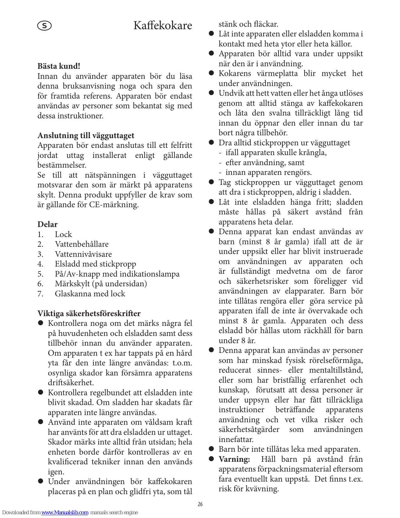 Viktiga säkerhetsföreskrifter Kontrollera noga om det märks några fel på huvudenheten och elsladden samt dess tillbehör innan du använder apparaten. Om apparaten t ex har tappats på en hård yta får den inte längre användas: t.o.m. osynliga skador kan försämra apparatens driftsäkerhet. Kontrollera regelbundet att elsladden inte blivit skadad. Om sladden har skadats får apparaten inte längre användas. Använd inte apparaten om våldsam kraft har använts för att dra elsladden ur uttaget. Skador märks inte alltid från utsidan; hela enheten borde därför kontrolleras av en kvalificerad tekniker innan den används igen. Under användningen bör kaffekokaren placeras på en plan och glidfri yta, som tål Downloaded from www.Manualslib.com manuals search engine Apparaten är avsedd för hemmabruk eller liknande användning, såsom - i kontor och andra kommersiella miljöer, - inom jordbrukssektorn, - för kunder i hotell, motell och andra liknande anläggningar, - för kunder i bed-and-breakfast hus. Inget ansvar godtas om skada uppkommer till följd av felaktig användning, eller om dessa instruktioner inte följts. För att uppfylla säkerhetsbestämmelserna och undvika risker får reparationer av elektriska apparater endast utföras av fackmän, inklusive byte av sladden. Om det krävs en reparation, bör du vänligen skicka apparaten till någon av våra kundtjänstavdelningar. Adresserna finns i bilagan till denna bruksanvisning. Så brygger du kaffe – Fyll med vatten: Öppna locket och fyll vattenbehållaren med önskad mängd vatten. – Sätt i pappersfilter: Sätt i ett pappersfilter av storlek 4 i filterhållaren, då du först vikit ner den perforerade sidan av filtret. – Fyll med malet kaffe: För varje 125 ml kopp krävs cirka 6 g (= 1½ - 2 teskedar) fint malet kaffe. Stäng vattenbehållarens lock. – Tillred kaffe i glaskannan: Sätt locket på kannan och placera kannan på värmeplattan. Om locket monterats korrekt kommer det att förhindra att “droppstopp”mekanismen i filterhållaren fungerar under bryggningsprocessen. – Starta bryggningsomgången: Sätt stickproppen i ett lämpligt vägguttag och använd på/av-knappen för att koppla på kaffekokaren. Filtreringsomgången startar och vattnet rinner genom filtret. – Tag bort glaskannan: Vänta tills allt vatten har runnit genom filtret innan du tar kannan från apparaten. – Stäng av kaffekokaren: Kaffet kan hållas varmt i kannan om du lämnar kannan på den varma plattan. Plattan hålls varm tills apparaten stängs av. Stäng alltid av apparaten efter användning och dra stickproppen ur vägguttaget. Innan första användningen Innan kaffekokaren används för första gången bör du låta apparaten göra två eller tre filtreringsomgångar med maximal mängd vatten men utan kaffepulver. Detta bör också göras om apparaten inte varit i användning under en längre tid, samt efter avkalkning. Allmän information – Måttskalan på vattenbehållaren och glaskannan gör det lättare för dig att fylla behållaren med korrekt mängd rent vatten. Den vänstra skalan är avsedd för 125 ml koppar av normal storlek, medan den högra skalan är avsedd för mindre koppar. Se till att den maximala vattenmängden inte överskrids. Om flera bryggningsomgångar krävs efter varandra bör du stänga av kokaren efter varje omgång och låta apparaten svalna i ungefär 5 minuter. Viktig anmärkning: När du fyller apparaten med färskt vatten strax efter en bryggning slutförts finns det en risk för skållning då hett vatten utlöses genom vattenavloppet. Avkalkning Beroende vattenkvaliteten (kalkinnehållet) på din hemort samt på apparatens användningstäthet, behöver alla apparater som används med varmt vatten avkalkas (dvs kalkavlagringar avlägsnas) regelbundet för att fungera ordentligt. Garantikrav kan inte godkännas om apparaten inte fungerar på grund av otillräcklig avkalkning. En förlängning av bryggningstiden och högre oljud vid bryggningen indikerar att avkalkning av kaffekokaren är nödvändig. En alltför stor kalkavlagring är mycket svår att avlägsna, trots att avkalkningsmedel