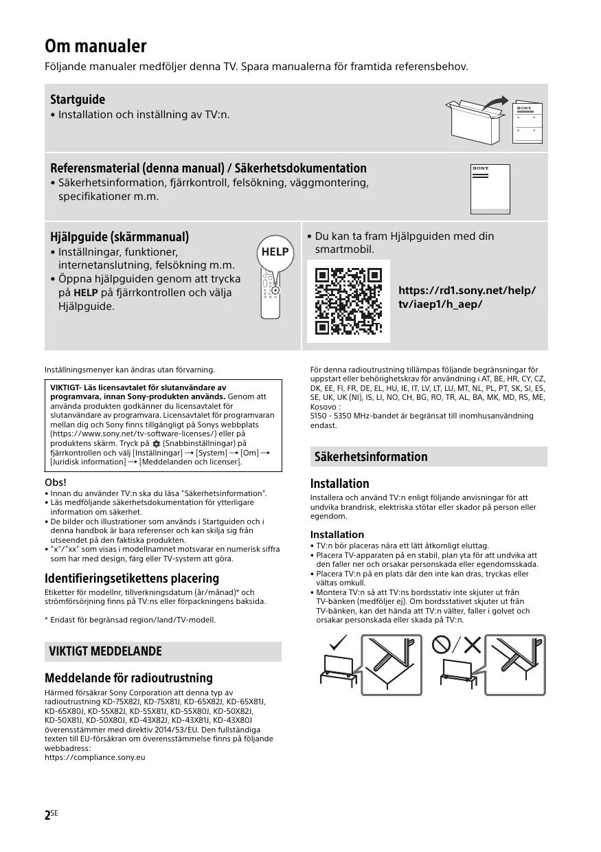 (RÈGLEMENT DÉLÉGUÉ (UE) 2019/2013 DE LA COMMISSION) KD-75X82J (403706), KD-75X81J (403705), KD-65X82J (403703), KD-65X81J (403702), KD-65X80J (403701), KD-55X82J (403698), Para obtener instrucciones acerca de la instalación del Soporte de pared, consulte la información de instalación (Soporte de pared) en la página del producto de su modelo de televisor. https://www.sony.eu/support • Siga la guía de instrucciones suministrada con el Soporte de pared correspondiente a su modelo. Para instalar este televisor, es necesario disponer de conocimientos suficientes, especialmente para determinar si la pared es lo bastante resistente para aguantar el peso del televisor.
