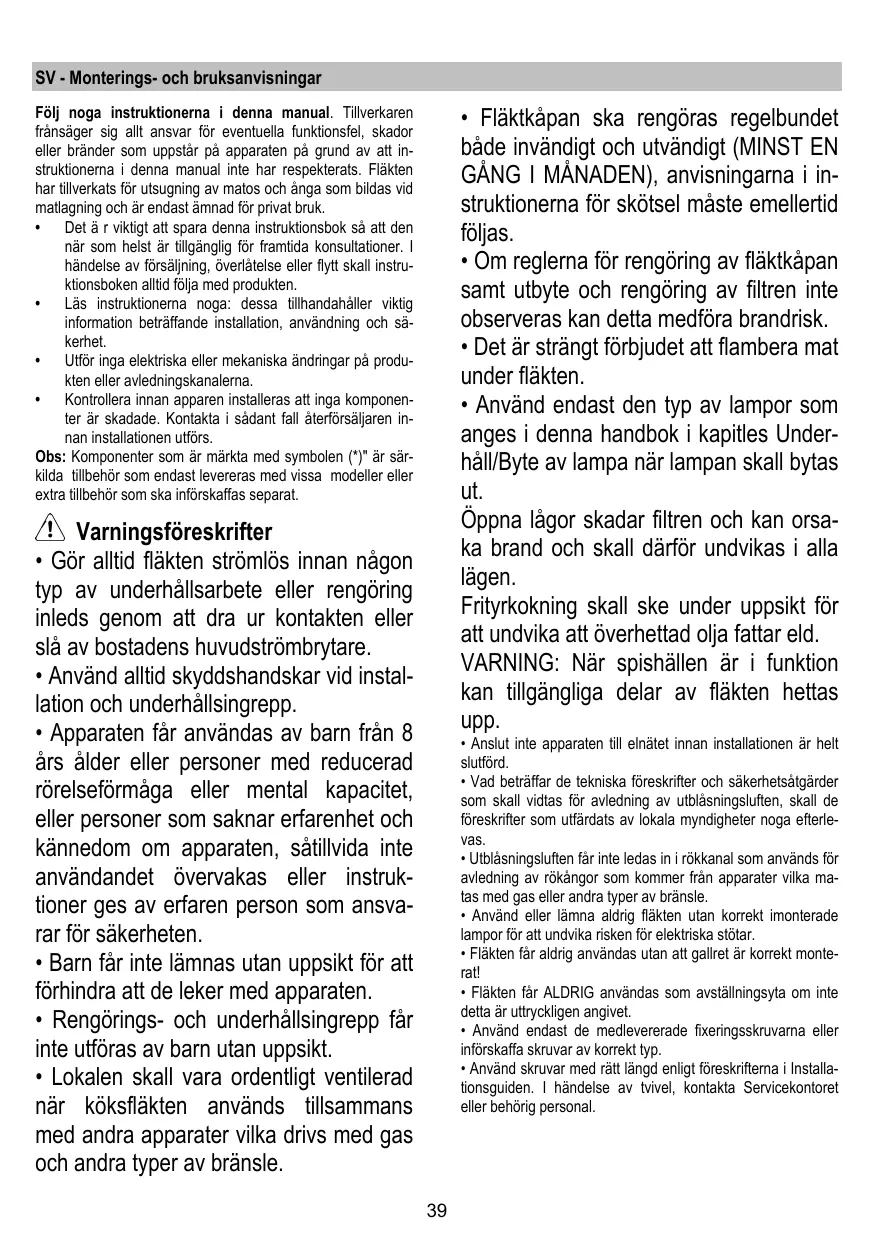Montagevoorschriften en gebruiksaanwijzingen Montage- und Gebrauchsanweisung Asennus- ja käyttöohjeet Monterings- och bruksanvisningar • Para la sustitución de la lámpara sólo utilizar el tipo de lámpara indicado en la sección de mantenimiento/sustitución de este manual. El uso de una llama libre es perjudicial para los filtros y puede provocar incendios, por lo tanto, debe evitarse en cualquier caso. Los fritos debe realizarse con cuidado para evitar que el aceite caliente prenda fuego. ATENCIÓN: Cuando la placa de cocción está funcionando las partes accesibles de la campana pueden calentarse.