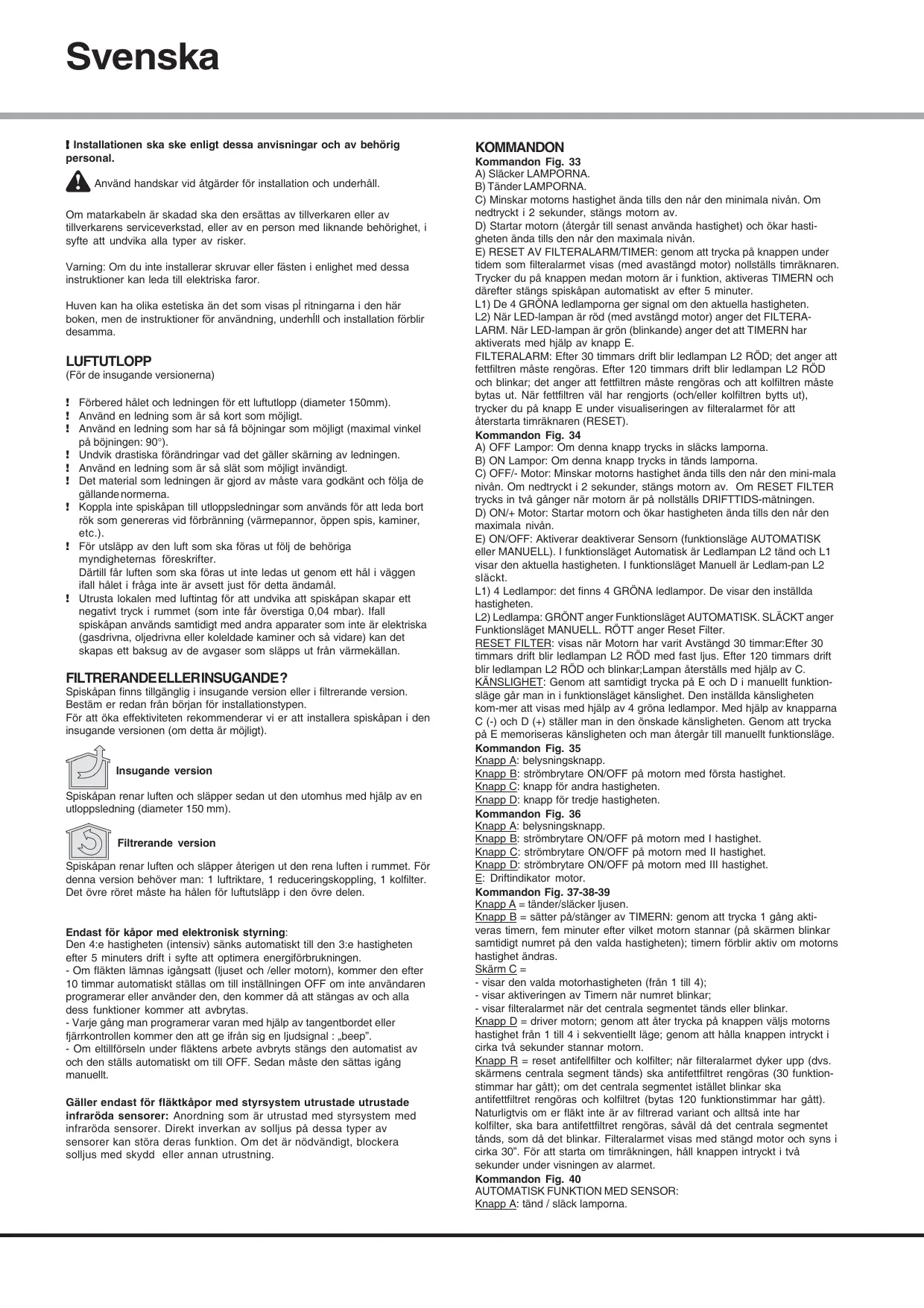 Begransing av arbetstiden: om fläkten Förblir igånsatt (belysningen och / eller motom)kommen den att after 10 timmar utan att användaren programerar den att sattas in på inställningen OFF och alla Funktionerkommen att stängas av.