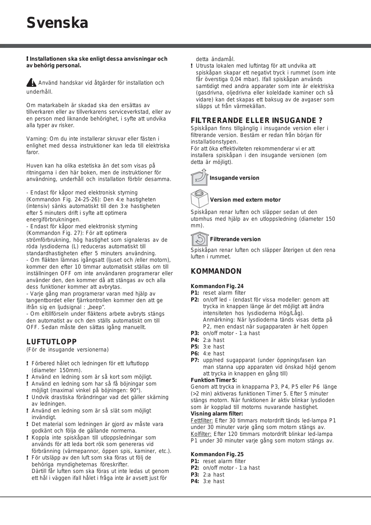 - Endast for kapor med elektronisk styrning (Kommandon Fig. 24-25-26): Den 4:e hastigheten (intensiv) sänks automatiskt till den 3:e hastigheten after 5 minuters drift i syfte att optimera energiförbrukningen.