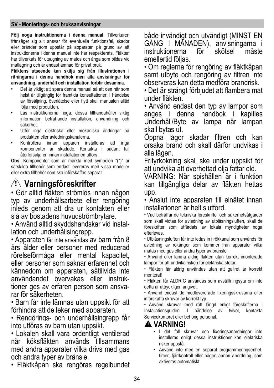 både invändigt och utvändigt (MINST EN GÅNG I MÅNADEN), anvisningarna i instruktionerna för skötsel måste emellertid följas. • Om reglerna för rengöring av fläktkåpan samt utbyte och rengöring av filtren inte observeras kan detta medföra brandrisk. • Det är strängt förbjudet att flambera mat under fläkten. • Använd endast den typ av lampor som anges i denna handbok i kapitles Underhåll/Byte av lampa när lampan skall bytas ut. Öppna lågor skadar filtren och kan orsaka brand och skall därför undvikas i alla lägen. Frityrkokning skall ske under uppsikt för att undvika att överhettad olja fattar eld. VARNING: När spishällen är i funktion kan tillgängliga delar av fläkten hettas upp. • Anslut inte apparaten till elnätet innan installationen är helt slutförd.