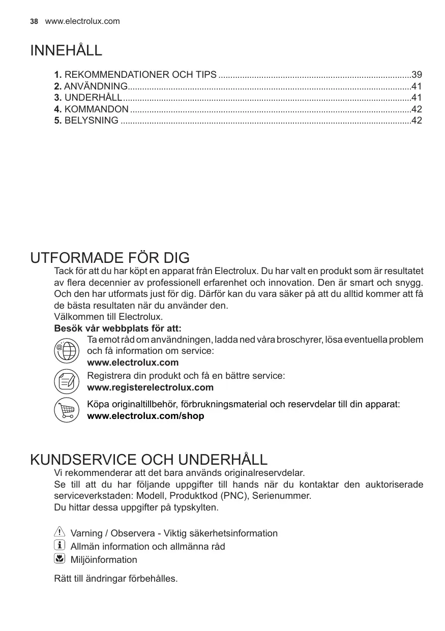 INNEHÅLL 1. REKOMMENDATIONER OCH TIPS39 2. ANVÄNDNING41 3. UNDERHÅLL41 4. KOMMANDON42 5. BELYSNING42