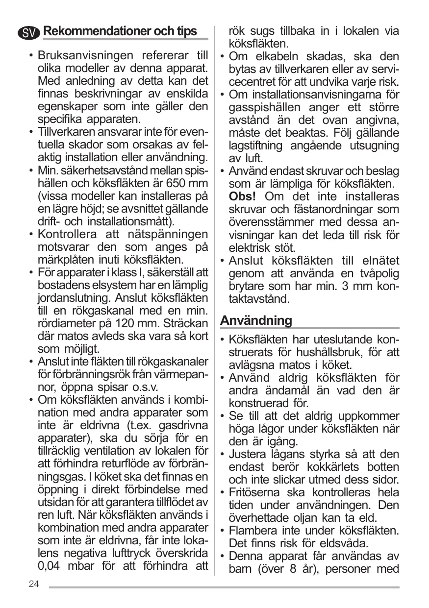 Tillverkaren ansvarar inte für even- tuella skador som orsakas av fel- aktig installation eller användning. Min. säkerhetsavständ mellan spis- hällen och küksfläkten är 650 mm (vissa modeller kan installeras pà en lägre hôjd; se avsnittet gällande drift- och installationsmätt). Kontrollera att nätspänningen motsvarar den som anges pà märkplâten inuti kôksfläkten.