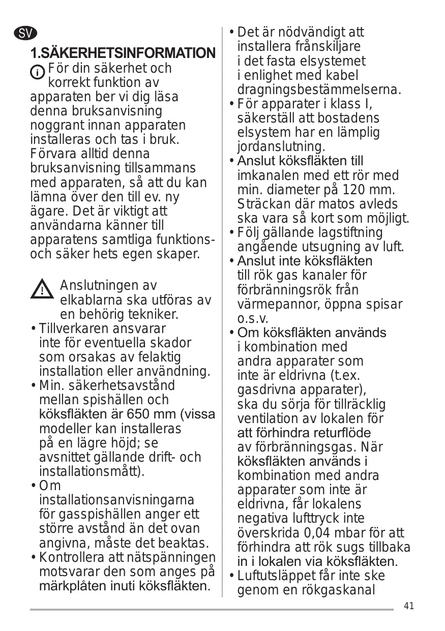 Les dispositifs de sectionnement doivent être montés dans l’installation fixe conformément aux normes sur les systèmes de câblage. Pour les appareils de Classe I, s’assurer que l’installation électrique de votre intérieur dispose d’une mise à la terre adéquate. Reliez l’aspirateur du conduit de cheminée avec un tube ayant un diamètre minimum de 120 mm. Le parcours des fumées doit être le plus court possible. Respecter toutes les normes concernant l’évacuation de l’air. Ne reliez pas la hotte aspirante aux conduits de cheminée qui acheminent les fumées de combustion (par ex. de chaudières, de cheminées, etc.). Si vous utilisez l’aspirateur en même temps que des appareils non électriques (par ex. fonctionnant au gaz), veillez à ce que la pièce soit adéquatement ventilée, afin d’empêcher le retour du flux des gaz d’évacuation. Si vous utilisez la hotte de cuisine en même temps que des appareils non alimentés à l’électricité, la pression négative dans la pièce ne doit pas dépasser 0,04 mbar, afin d’éviter que les fumées