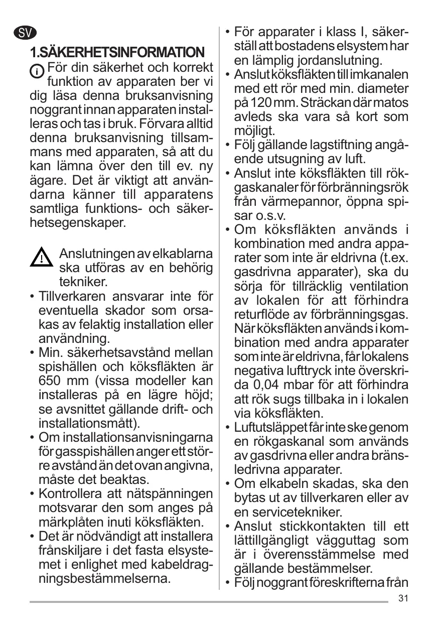 • För apparater i klass I, säkerställ att bostadens elsystem har en lämplig jordanslutning. • Anslut köksfläkten till imkanalen med ett rör med min. diameter på 120 mm. Sträckan där matos avleds ska vara så kort som möjligt. • Följ gällande lagstiftning angående utsugning av luft. • Anslut inte köksfläkten till rökgaskanaler för förbränningsrök från värmepannor, öppna spisar o.s.v. • Om köksfläkten används i kombination med andra apparater som inte är eldrivna (t.ex. gasdrivna apparater), ska du sörja för tillräcklig ventilation av lokalen för att förhindra returflöde av förbränningsgas. När köksfläkten används i kombination med andra apparater som inte är eldrivna, får lokalens negativa lufttryck inte överskrida 0,04 mbar för att förhindra att rök sugs tillbaka in i lokalen via köksfläkten. • Luftutsläppet får inte ske genom en rökgaskanal som används av gasdrivna eller andra bränsledrivna apparater. • Om elkabeln skadas, ska den bytas ut av tillverkaren eller av en servicetekniker. • Anslut stickkontakten till ett lättillgängligt vägguttag som är i överensstämmelse med gällande bestämmelser. • Följ noggrant föreskrifterna från 31