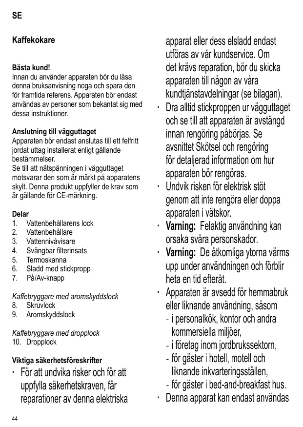 Kaffekokare Bästa kund! Innan du använder apparaten bör du läsa denna bruksanvisning noga och spara den för framtida referens. Apparaten bör endast användas av personer som bekantat sig med dessa instruktioner. Anslutning till vägguttaget Apparaten bör endast anslutas till ett felfritt jordat uttag installerat enligt gällande bestämmelser. Se till att nätspänningen i vägguttaget motsvarar den som är märkt på apparatens skylt. Denna produkt uppfyller de krav som är gällande för CE-märkning. Delar