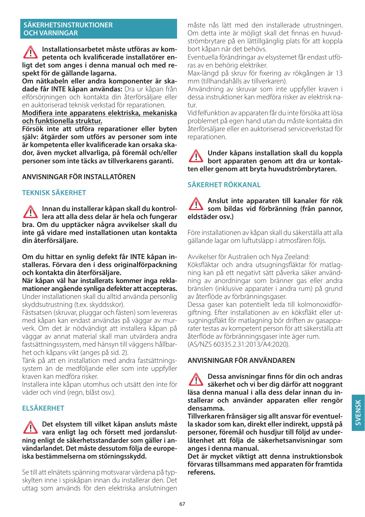 (y compris ceux qui se trouvent dans d’autres pièces) en raison du reflux des gaz de combustion. Ces gaz peuvent potentiellement entraîner une intoxication au monoxyde de carbone. Après l’installation d’une hotte de cuisine ou d’un autre aspirateur des fumées de cuisson, le fonctionnement des appareils à gaz canalisé doit être testé par une personne compétente pour vérifier l’absence de reflux des gaz de combustion. (AS/NZS 60335.2.31:2013/A4:2020). MISES EN GARDE POUR L'UTILISATEUR Ces mises en garde ont été rédigées pour votre sécurité et pour celle d'autrui, nous vous prions donc de lire attentivement toutes les parties de ce manuel avant d'utiliser l'appareil ou de le nettoyer. Le fabricant décline toute responsabilité pour d’éventuels dommages, directs ou indirects, pouvant être causés aux personnes, aux choses et aux animaux domestiques, suite au non-respect des mises en garde de sécurité indiquées dans ce manuel. Il est très important que ce manuel d'instructions soit conservé avec l'appareil pour toute consultation future.