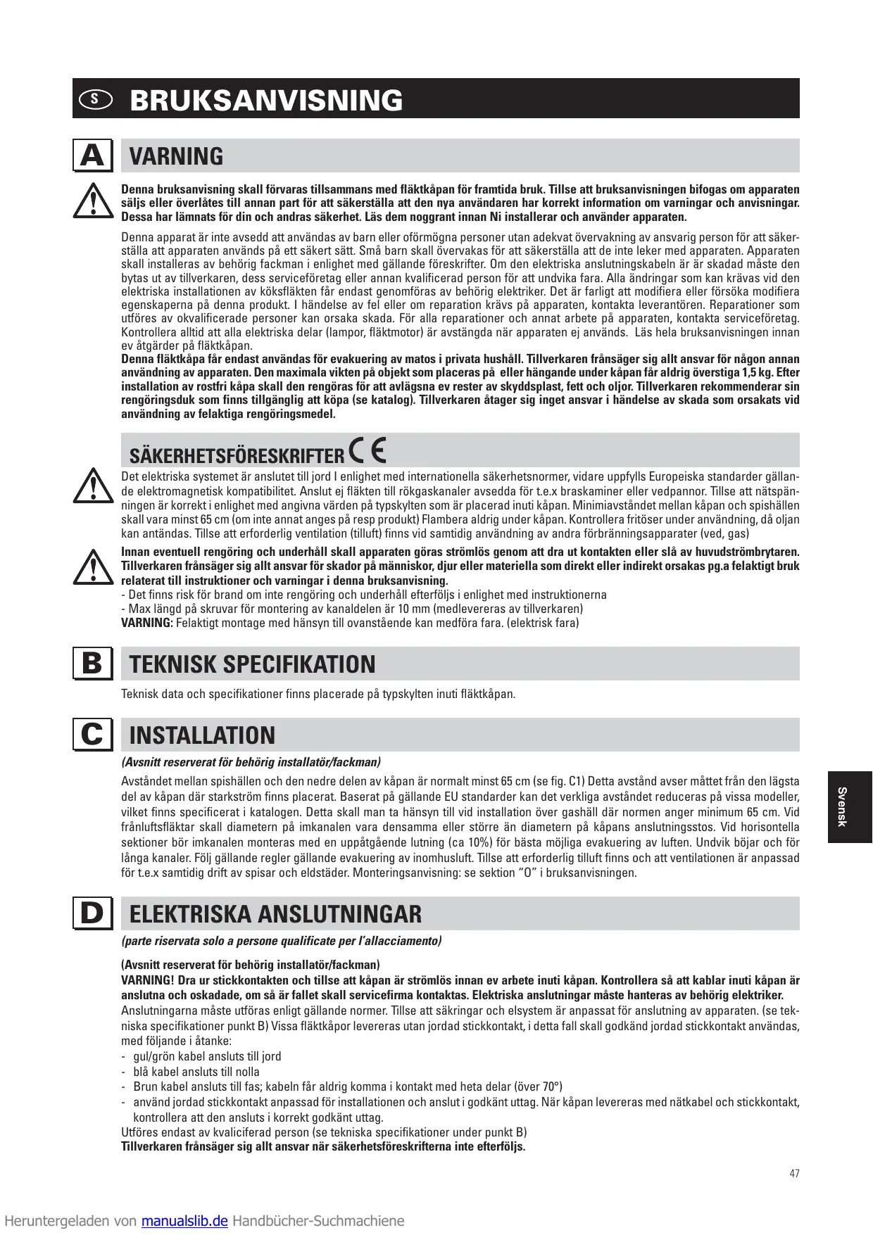 (partie réservée au personnel qualifié pour le branchement) ATTENTION! Toujours débrancher l’appareil avant de faire une opération quelconque à l’intérieur de la hotte. S’assurer qu’aucun fil n’est débranché ou coupé ; si c’est le cas, contacter le Service après-vente le plus proche. S’adresser à du personnel qualifié pour le branchement électrique. Les branchements doivent être effectués conformément aux dispositions de loi en vigueur. Vérifier si le disjoncteur et l’installation électrique peuvent supporter la charge de l’appareil (voir plaque des caractéristiques techniques au point B). Certains appareils peuvent être munis d’un câble sans fiche; la fiche à utiliser doit dans ce cas être de type «standardisé» en tenant compte que: - le fil jaune-vert doit être utilisé pour la mise à la terre; - le fil bleu doit être utilisé pour le neutre; - le fil marron doit être utilisé pour la phase, le câble ne doit pas être en contact avec les parties chaudes ayant une température supérieure à 70°C; - monter une fiche adaptée à la charge sur le câble d’alimentation et la brancher à une fiche de sécurité appropriée. Si un appareil fixe n’est pas muni d’un câble d’alimentation et d’une fiche, ou d’un autre dispositif pour le débrancher, avec une distance d’ouverture des contacts permettant la coupure de courant totale en cas de surtension, catégorie III, les instructions doivent indiquer que ces dispositifs de coupure doivent être prévus dans le réseau d’alimentation, conformément aux règles d’installation. Le câble de terre jaune/vert ne doit pas être interrompu par l’interrupteur. Avant de brancher l’appareil, vérifier si: - la tension d’alimentation correspond à celle indiquée sur la plaque caractéristiques techniques; - la prise de terre est correcte et fonctionnelle: - le système d’alimentation est muni d’un branchement à la terre efficace, conformément aux normes en vigueur ; - la prise ou l’interrupteur omnipolaire sont faciles à atteindre lorsque l’appareil est monté. Le fabricant décline toute responsabilité si les normes de sécurité ne sont pas respectées.