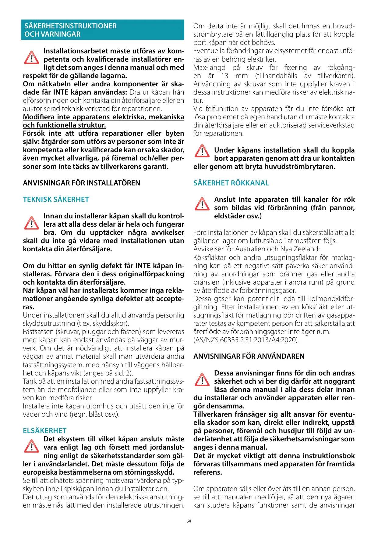 Divergencia normativa para Australia y Nueva Zelanda: Las campanas extractoras y otros extractores de humos de cocina pueden afectar negativamente al funcionamiento seguro de los aparatos que queman gas u otros combustibles (incluidos los que se encuentran en otras habitaciones) debido al reflujo de los gases de combustión. Dichos gases pueden, potencialmente, derivar en intoxicación por monóxido de carbono. Tras la instalación de una campana extractora u otro extractor de humos de cocina, una persona competente debe probar el funcionamiento de los aparatos de gas de combustión para cerciorarse de que no se produzca el reflujo de los mismos. (AS/NZS 60335.2.31:2013/A4:2020). No realice operaciones de limpieza con las partes de la campana aún calientes. Si no se realiza la limpieza según las modalidades y los productos indicados en este manual, esto puede conllevar un riesgo de incendio. Desconecte el interruptor general, si no va a usar el equipo durante un periodo de tiempo prolongado. En caso de utilizar simultáneamente otros equipos (calderas, estufas, hogares, etc.) alimentados con gas o con otros combustibles, prevea una adecuada ventilación del ambiente donde se realiza la aspiración de humos, según las normas vigentes.