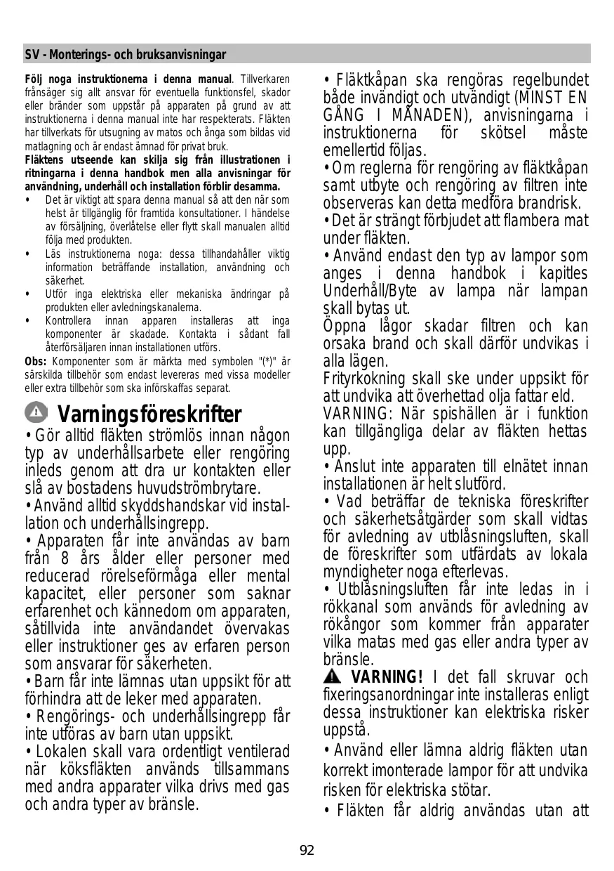 Montaje y modo de empleo Instruções para montagem e utilização ȅǻǾīǿǼȈ ȈȊȃǹȇȂȅȁȅīǾȈǾȈ Ȁǹǿ ȋȇǾȈǾȈ Monterings- och bruksanvisningar • La hotte doit être régulièrement nettoyée à la fois à l'intérieur et à l'extérieur (AU MOINS UNE FOIS PAR MOIS); cela devrait se faire en conformité avec les instructions d'entretien. Le non respect des instructions expressément fournies concernant le nettoyage de la hotte et des filtres peut provoquer des risques d'incendie. • Ne pas flamber d’aliments sous la hotte. • Pour le remplacement de la lampe, utilisez uniquement le type de lampe spécifié dans la section remplacement/maintenance lampe dans ce manuel. L'utilisation d'une flamme nue est dommageable pour les filtres et peut causer un incendie, par conséquent, il est déconseillé de l'utiliser. La friture doit être faite avec soin afin de s’assurer que l’huile surchauffée ne prenne pas feu. AVERTISSEMENT: Lorsque la table de cuisson est en fonctionnement, les parties accessibles de la hotte peuvent devenir très chaudes. • Ne pas brancher l'appareil au réseau électrique avant que l'installation ne soit complètement terminée. • En ce qui concerne les mesures techniques et de sécurité à prendre pour l'évacuation des fumées, respectez strictement les dispositions des règlements locales. • L’air ne doit pas être envoyé dans un conduit utilisé pour évacuer les fumées
