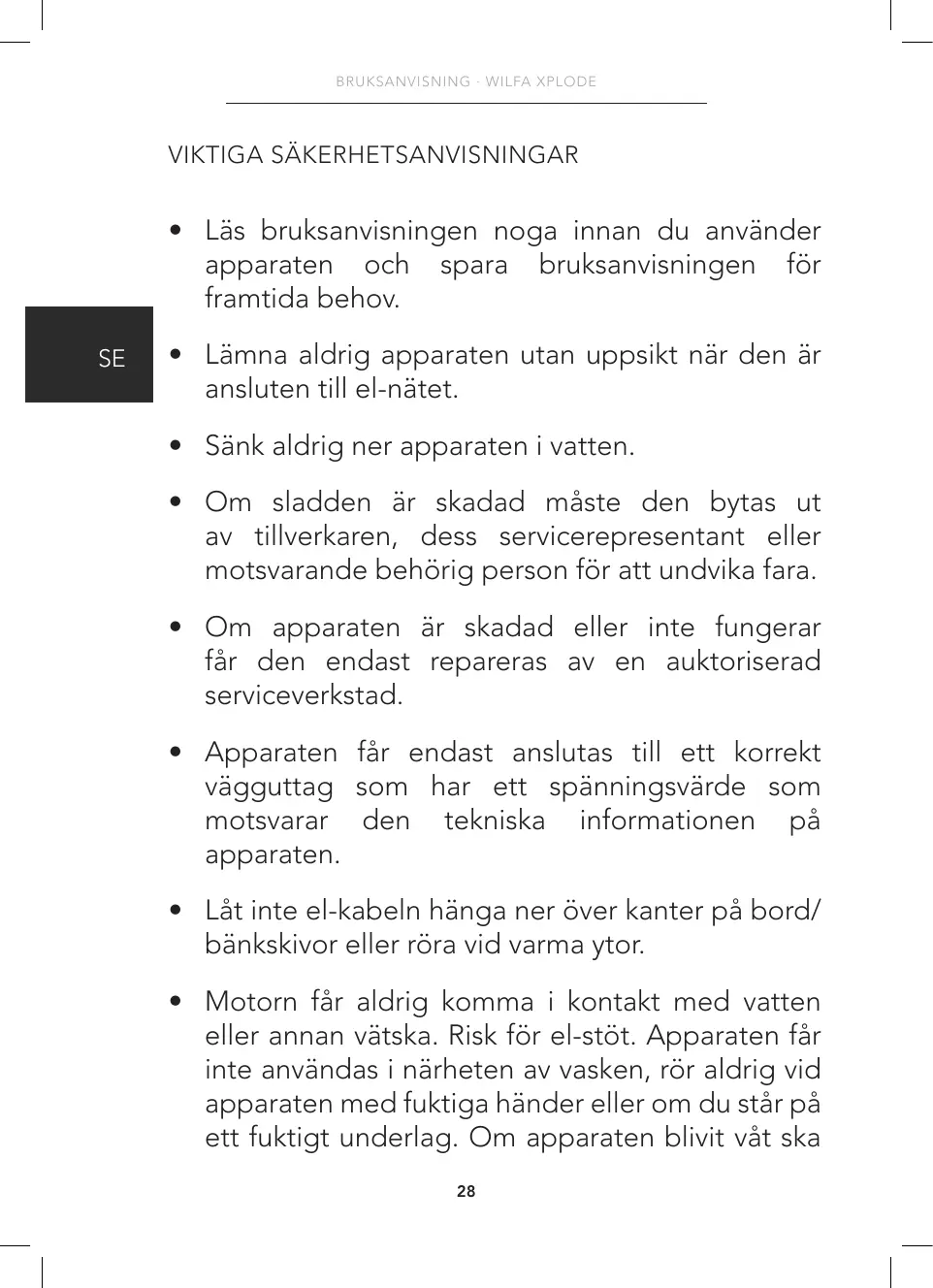 - Motorn får aldrig komma i kontakt med vatten eller annan vätska. Risk för el-stöt. Apparaten får inte användas i närheten av vasken, rör aldrig vid apparaten med fuktiga händer eller om du står på ett fuktigt underlag. Om apparaten blivit våt ska