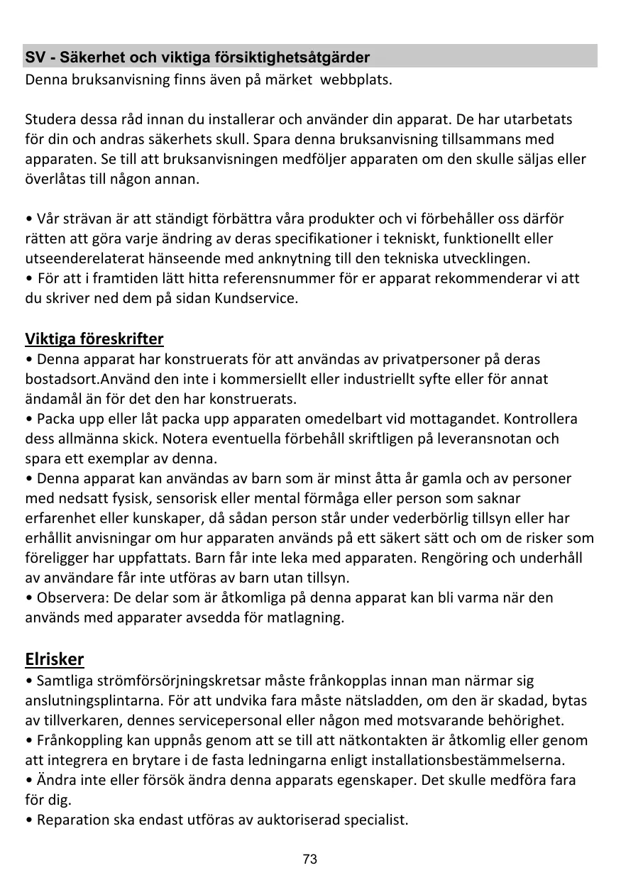 Innehållsförteckning SV - Säkerhet och viktiga försiktighetsåtgärder 73 Monterings- och bruksanvisningar 75 Användning 75 Installation 75 Elektrisk anslutning 75 Montering 75