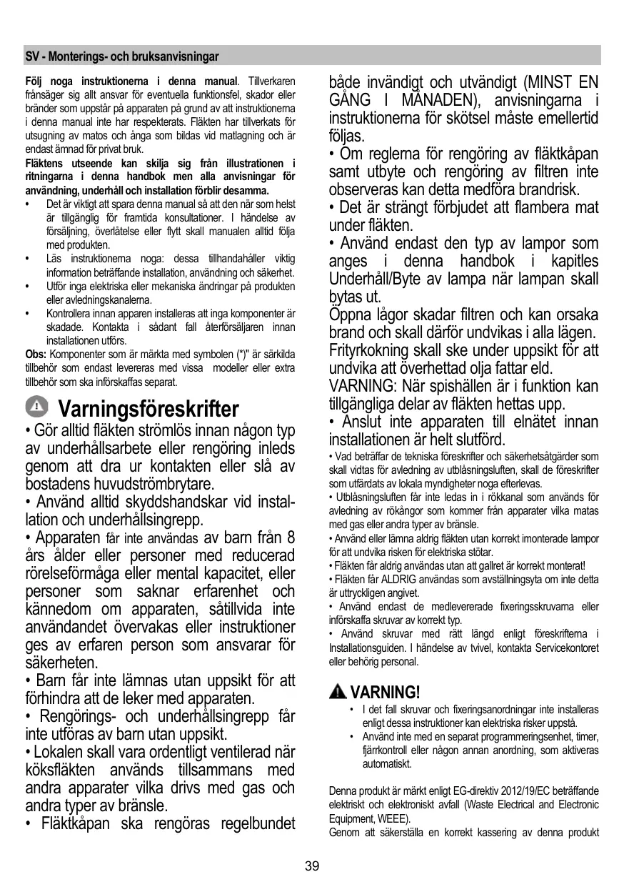 Följ noga instruktionerna i denna manual. Tillverkaren frånsäger sig allt ansvar för eventuella funktionsfel, skador eller bränder som uppstår på apparaten på grund av att instruktionerna i denna manual inte har respekterats. Fläkten har tillverkats för utsugning av matos och ånga som bildas vid matlagning och är endast ämnad för privat bruk. Fläktens utseende kan skilja sig från illustrationen i ritningarna i denna handbok men alla anvisningar för användning, underhåll och installation förblir desamma. • Det är viktigt att spara denna manual så att den när som helst är tillgänglig för framtida konsultationer. I händelse av försäljning, överlåtelse eller flytt skall manualen alltid följa med produkten. • Läs instruktionerna noga: dessa tillhandahåller viktig information beträffande installation, användning och säkerhet. • Utför inga elektriska eller mekaniska ändringar på produkten eller avledningskanalerna. • Kontrollera innan apparen installeras att inga komponenter är skadade. Kontakta i sådant fall återförsäljaren innan installationen utförs. Obs: Komponenter som är märkta med symbolen (*)" är särkilda tillbehör som endast levereras med vissa modeller eller extra tillbehör som ska införskaffas separat.