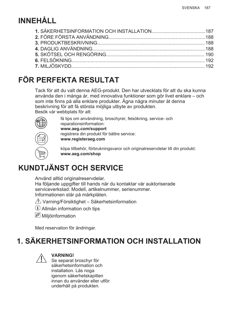 INNEHÅLL 1. SÄKERHETSINFORMATION OCH INSTALLATION187 2. FÖRE FÖRSTA ANVÄNDNING188 3. PRODUKTBESKRIVNING 188 4. DAGLIG ANVÄNDNING188 5. SKÖTSEL OCH RENGÖRING 190 6. FELSÖKNING 192 7. MILJÖSKYDD 192
