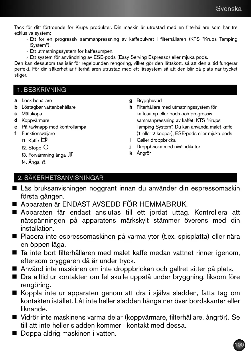 Español n Evitar el contacto del cable o de las manos con las partes calientes del aparato (bandeja calienta-tazas, portafiltros, boquilla de vapor). n No sumergir nunca el aparato en agua. n Mantener el aparato fuera del alcance de los niños, no dejar el cable colgando. n Seguir las instrucciones relativas al desincrustado. n No poner el aparato en marcha si está estropeado o si el cable está en mal estado. n Si el cable o cualquier otro elemento específico, estuvieran defectuosos, estos deberán ser sustituidos por el servicio técnico Krups únicamente, para evitar cualquier riesgo. En ningún caso, deberá abrir usted mismo el aparato. n Comprobar que el portafiltros está bien cerrado antes de elaborar el café. n Este aparato no es apto para ser utilizado por personas (incluidos niños) con alguna discapacidad física, sensorial o mental, o con falta de experiencia y conocimientos, a no ser que estén vigiladas o hayan recibido instrucciones sobre cómo utilizar el electrodoméstico por una persona responsabilizada de su seguridad. n Hay que vigilar a los niños para impedir que jueguen con el aparato. n Los accesorios y partes desmontables del aparato no se pueden meter en el lavavajillas. n Este aparato está diseñado únicamente para un uso doméstico. n La garantía no cubre el uso del aparato: