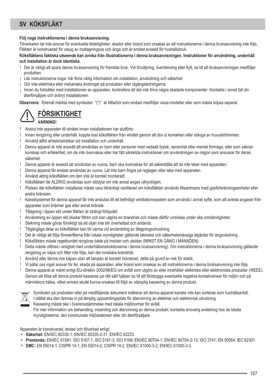 VARNING! Anslut inte apparaten till elnätet innan installationen har slutförts. Innan rengöring eller underhåll, koppla loss köksfläkten från elnätet genom att dra ut kontakten eller stänga av huvudströmmen. Använd alltid arbetshandskar vid installation och underhåll. Denna apparat är inte avsedd att användas av barn eller personer med nedsatt fysisk, sensorisk eller mental förmåga, eller som saknar kunskap och erfarenhet, om de inte övervakas eller har fått särskilda instruktioner om användningen av någon som ansvarar för deras säkerhet. Denna apparat är avsedd att användas av vuxna, barn ska övervakas för att säkerställa att de inte leker med apparaten. Denna apparat får endast användas av vuxna. Låt inte barn fingra på reglagen eller leka med apparaten. Använd aldrig köksfläkten om den inte är korrekt monterad! Köksfläkten får ALDRIG användas som stödyta om inte annat anges uttryckligen. Platsen där köksfläkten installeras måste vara tillräckligt ventilerad om köksfläkten används tillsammans med gasförbränningsenheter eller andra bränslen. Kanalsystemet för denna apparat får inte anslutas till ett befintligt ventilationssystem som används i annat syfte, som att avleda avgaser från apparater som bränner gas eller annat bränsle. Tillagning i öppen eld under fläkten är strängt förbjudet. Användning av öppen eld skadar filtren och kan utgöra en brandrisk och måste därför undvikas under alla omständigheter. Stekning måste göras försiktigt så att oljan inte blir överhettad och antänds. Tillgängliga delar av köksfläkten kan bli varma vid användning av tillagningsutrustning. Det är viktigt att följa föreskrifterna från lokala myndigheter gällande tekniska och säkerhetsmässiga åtgärder för ångavledning. Köksfläkten måste regelbundet rengöras både på insidan och utsidan (MINST EN GÅNG I MÅNADEN). Detta måste utföras i enlighet med underhållsinstruktionerna i denna bruksanvisning). Om instruktionerna i denna bruksanvisning gällande rengöring av kåpa och filter inte följs, kan det innebära brandrisk. Använd eller lämna inte kåpan utan att lampan är korrekt monterad, detta på grund av risk för elstöt. Vi påtar oss inget ansvar för fel, skada på apparaten, eller brand som orsakas av att instruktionerna i denna bruksanvisning inte följs. Denna apparat är märkt enligt EU-direktiv 2002/96/EG om avfall som utgörs av eller innehåller elektriska eller elektroniska produkter (WEEE). Genom att tillse att denna produkt kasseras på rätt sätt hjälper du till att förebygga eventuella negativa konsekvenser för miljön och på människors hälsa, vilket annars skulle kunna orsakas till följd av olämplig kassering av denna produkt.