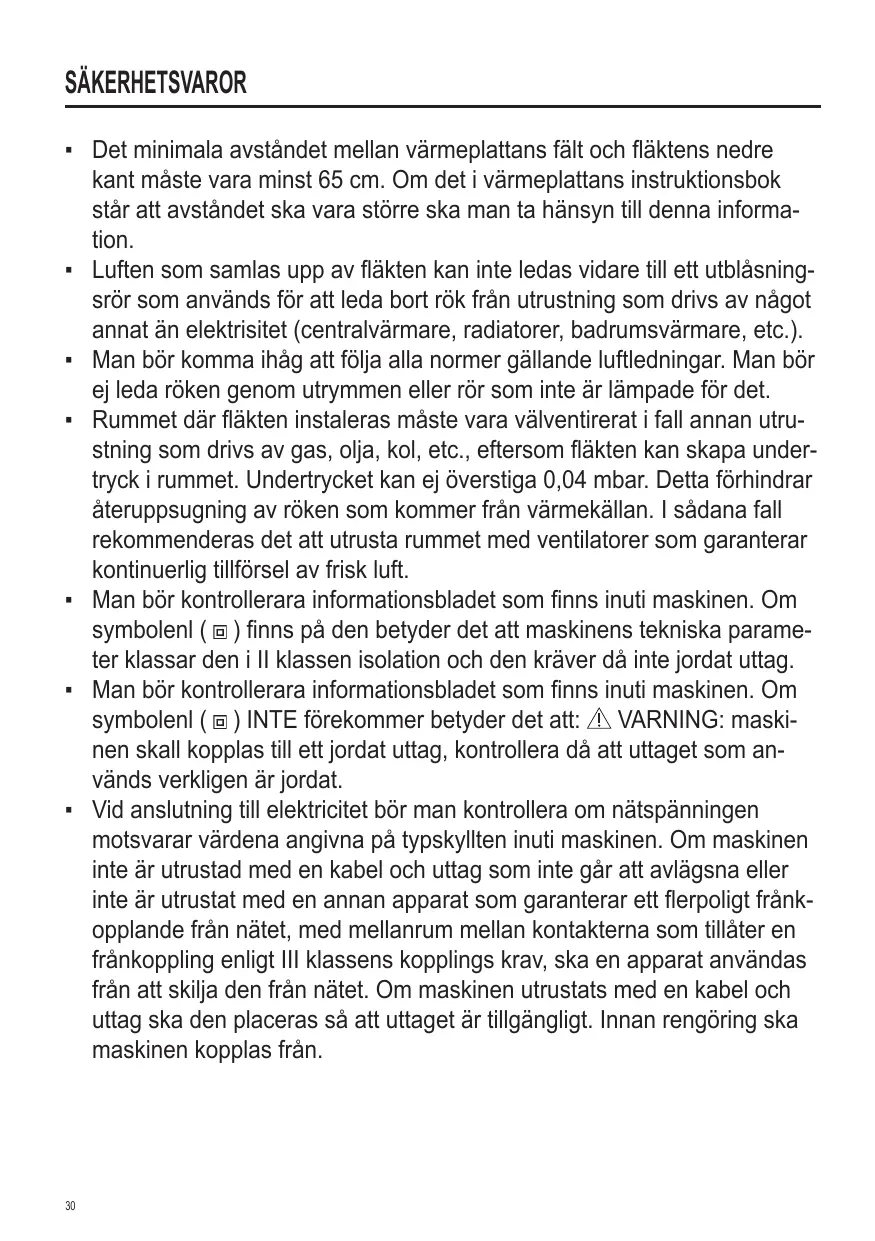 ▪ L’air aspiré ne doit pas être canalisé dans un conduit qui est utilisé pour évacuer les fumées produites par des appareils alimentés par des sources d’énergies autres que l’énergie électrique (installations de chauffage central, radiateurs, chauffe-eau, etc.). ▪ Pour évacuer l’air qui doit être éliminé respectez les prescriptions des autorités compétentes. De plus l’air qui doit être évacué ne doit pas être déchargé dans une cavité du mur, à moins que cette cavité soit prévue pour ce but. ▪ Prévoyez une aération de la pièce adéquate quand une hotte et des appareils alimentés par une énergie autre que l’énergie électrique (poêle à gaz, à huile, à charbon etc.) sont utilisés en même temps. En effet, en évacuant l’air, la hotte pourrait créer une dépression dans la pièce. La pression négative de la pièce ne doit pas dépasser 0,04mbar, évitant ainsi que la source de chaleur provoque un appel des gaz qui doivent être évacués. Il est donc nécessaire d’équiper la pièce de prises d’air alimentant un flux d’air frais constant. ▪ Contrôler la plaque des caractéristiques techniques se trouvant à l’intérieur de l’appareil; si le symbole ( ) figure sur la plaque suivre les instructions suivantes: cet appareil est construit pour appartenir à la classe d’isolation II ; il ne doit donc pas être relié à la terre. ▪ Contrôler la plaque des caractéristiques techniques se trouvant à l’intérieur de l’appareil; si le symbole ( ) NE figure pas sur la plaque suivre les instructions suivantes: ATTENTION: cet appareil doit être relié à la terre. Lors du raccordement électrique s’assurer que la prise de courant est équipée d’une connexion de mise à la terre. ▪ Lors du raccordement électrique assurez-vous que les valeurs de tension correspondent à celles qui sont indiquées sur la plaque des caractéristiques de l’appareil, qui se trouve à l’intérieur de celui-ci. Si votre appareil, n’a pas de câble flexible qui ne peut pas être séparé ni de prise, ou bien d’autre dispositif qui garantisse le débranchement de tous les 10