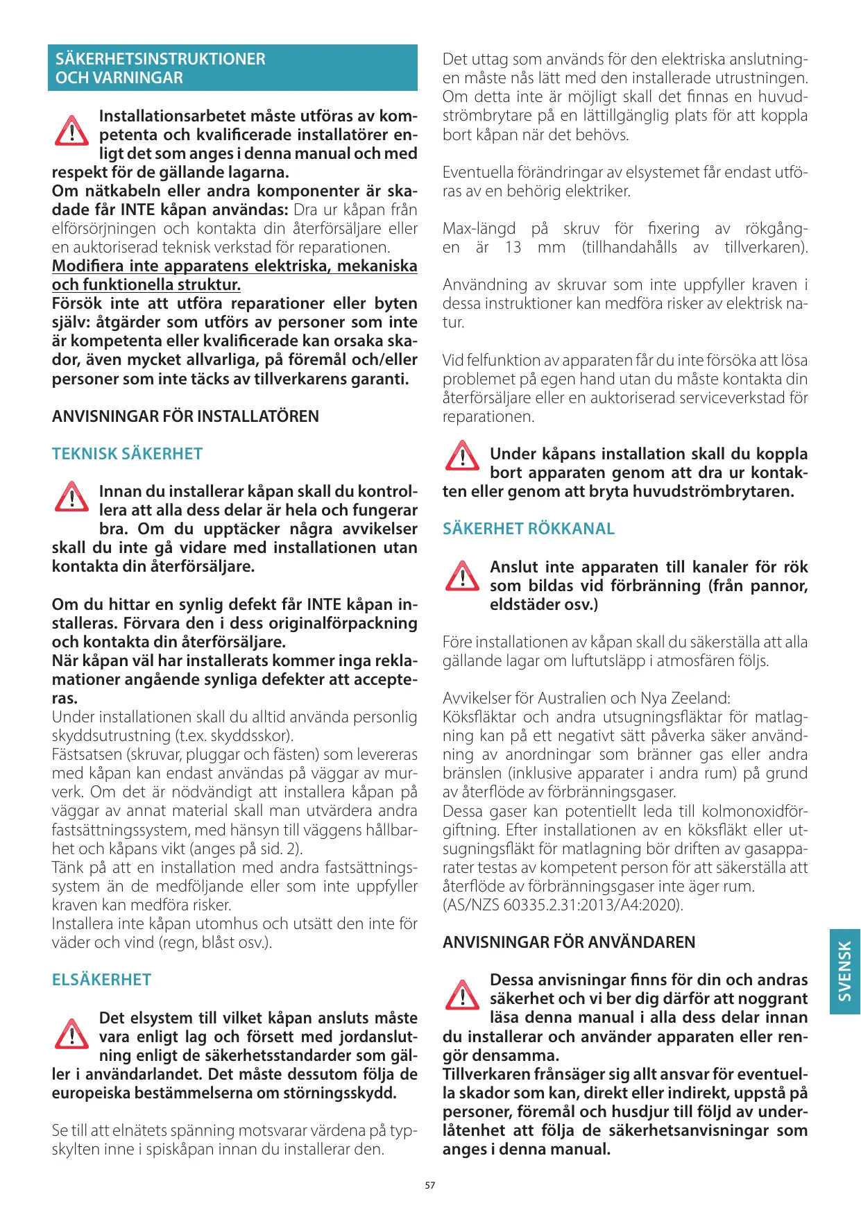 Avant l'installation de la hotte, s'assurer que toutes les normes en vigueur sur l’évacuation de l'air à l'extérieur de la pièce sont respectées. Déviation pour l’Australie et la Nouvelle Zélande: Les hottes de cuisine et les autres aspirateurs des fumées de cuisson peuvent nuire au bon fonctionnement des appareils qui brûlent du gaz ou d’autres combustibles (y compris ceux qui se trouvent dans d’autres pièces) en raison du reflux des gaz de combustion. Ces gaz peuvent potentiellement entraîner une intoxication au monoxyde de carbone. Après l’installation d’une hotte de cuisine ou d’un autre aspirateur des fumées de cuisson, le fonctionnement des appareils à gaz canalisé doit être testé par une personne compétente pour vérifier l’absence de reflux des gaz de combustion. (AS/NZS 60335.2.31:2013/A4:2020). 22