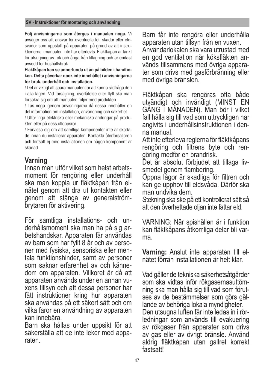 Avant toute opération de nettoyage ou d’entretien, débranchez la hotte du réseau électrique en retirant la prise ou en coupant l’interrupteur général de l’habitation. Pour toute opération d’installation et d’entretien, utilisez des gants de protection. L’appareil n’est pas destiné à une utilisation par des enfants (moins de 8 ans) ou des personnes à capacités physiques, sensorielles ou mentales réduites et sans expérience et connaissance à moins qu’ils ne soient sous la supervision ou formés sur l’utilisation de l’appareil par une personne responsable de leur sécurité. Les enfants doivent être surveillés afin qu’ils ne jouent pas avec l’appareil.