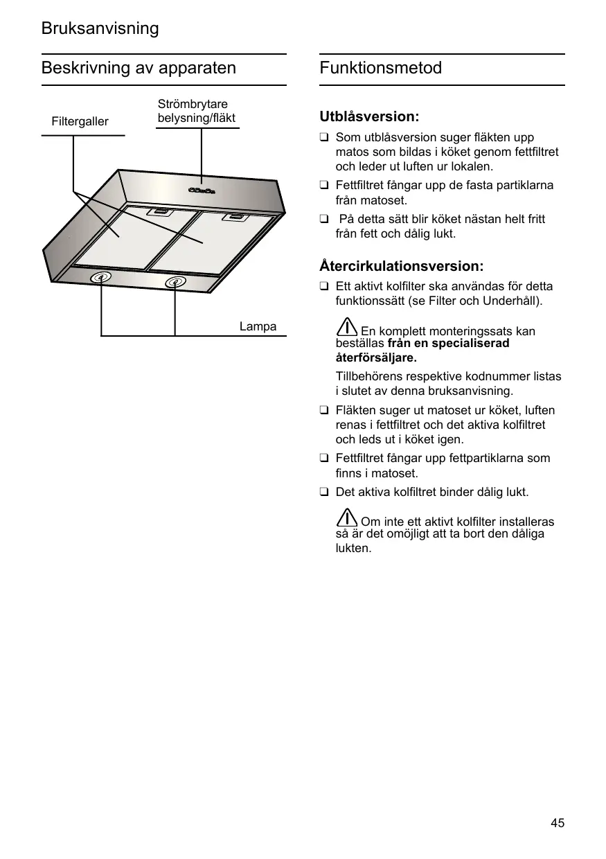 ❑ Le ventilateur de la hotte aspirante aspire les buées qui traversent le filtre à graisse et celui à charbon actif avant de revenir dans la cuisine. ❑ Le filtre à graisse retient les particules solides en suspension dans les buées de cuisson. ❑ Le filtre à charbon actif retient les substances odoriférantes. Si vous n’incorporez aucun filtre au charbon actif, impossible de retenir les odeurs présentes dans les buées de cuisson.