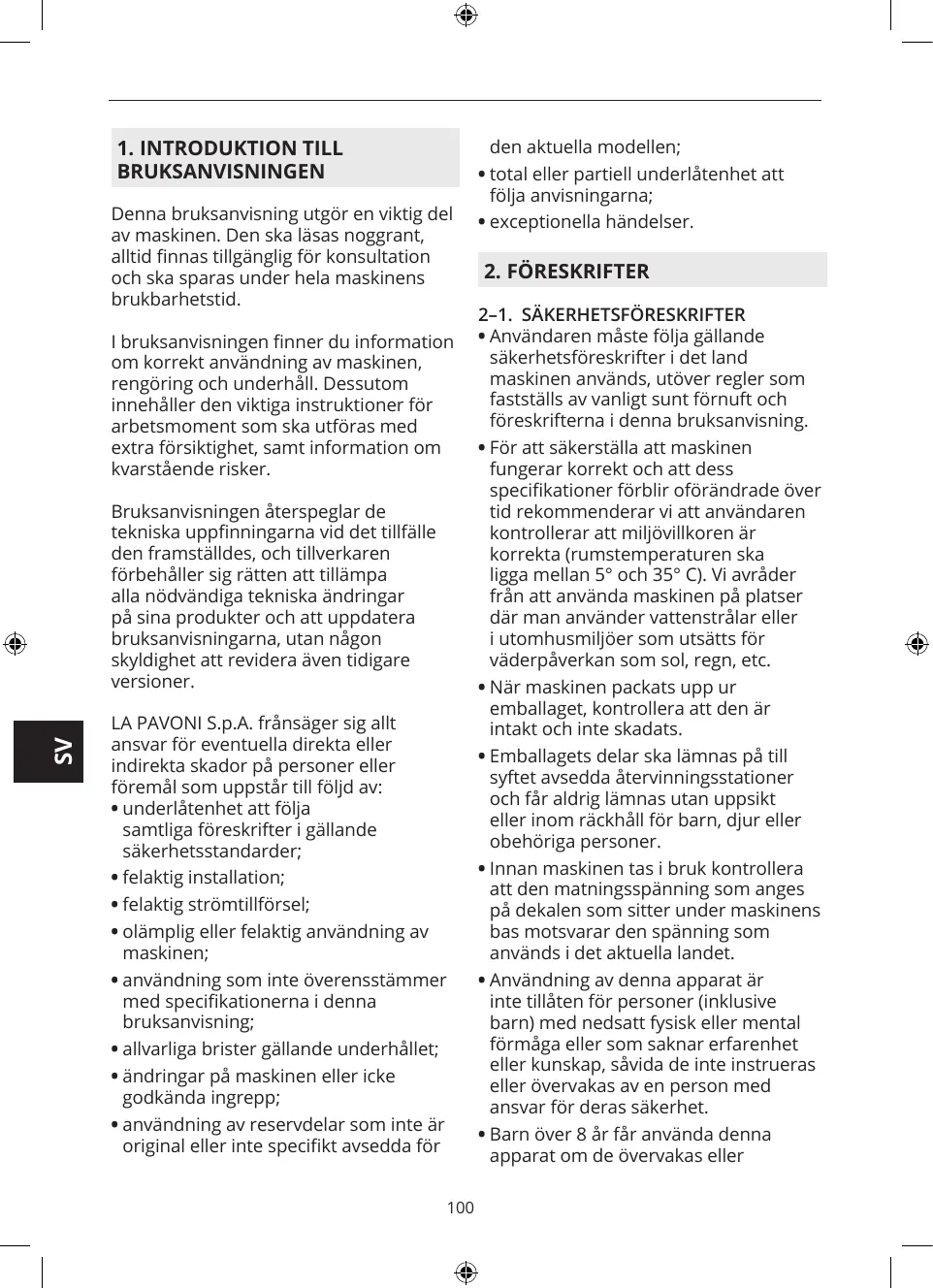 Bruksanvisningen återspeglar de tekniska uppfinningarna vid det tillfälle den framställdes, och tillverkaren förbehåller sig rätten att tillämpa alla nödvändiga tekniska ändringar på sina produkter och att uppdatera bruksanvisningarna, utan någon skyldighet att revidera även tidigare versioner. LA PAVONI S.p.A. frånsäger sig allt ansvar för eventuella direkta eller indirekta skador på personer eller föremål som uppstår till följd av: