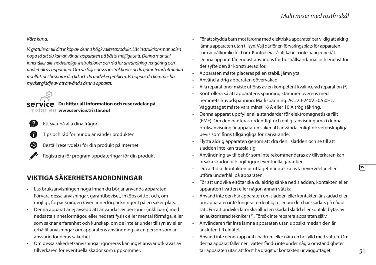 Vous pouvez trouver tous les renseignements et toutes les pièces de rechange sur www.service.tristar.eu ! Une réponse à toutes vos questions