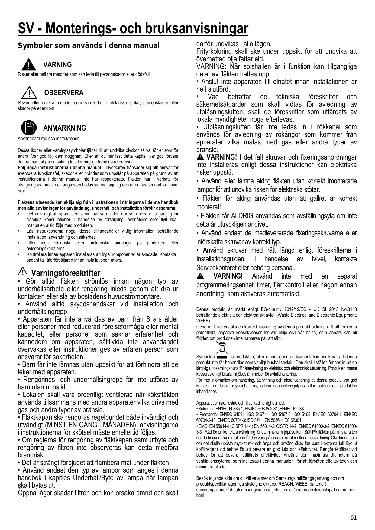 Symbolen på produkten, eller i medföljande dokumentation, indikerar att denna produkt inte får behandlas som vanligt hushållsavfall. Den skall i stället lämnas in på en lämplig uppsamlingsplats för återvinning av elektrisk och elektronisk utrustning. Produkten måste kasseras enligt lokala miljöbestämmelser för avfallshantering. För mer information om hantering, återvinning och återanvändning av denna produkt, var god kontakta de lokala myndigheterna, ortens sophanteringstjänst eller butiken där produkten inhandlades. Apparat utformad, testad och tillverkad i enlighet med: • Säkerhet: EN/IEC 60335-1; EN/IEC 60335-2-31, EN/IEC 62233. • Prestanda: EN/IEC 61591; ISO 5167-1; ISO 5167-3; ISO 5168; EN/IEC 60704-1; EN/IEC 60704-2-13; EN/IEC 60704-3; ISO 3741; EN 50564; IEC 62301. • EMC: EN 55014-1; CISPR 14-1; EN 55014-2; CISPR 14-2; EN/IEC 61000-3-2; EN/IEC 610003-3. Råd för en korrekt användning för att minska miljöpåverkan: Sätt PÅ fläkten på minsta farten när du börjar att laga mat och låt den vara på i några minuter efter att du är färdig. Öka farten bara om det skulle uppstå mycket rök och ånga och använd ökad fart bara i extrema fall. Byt ut kolfiltret(en) vid behov för att bevara en god lukt och effektivitet. Rengör fettfiltret vid behov för att bevara fettfiltrets effektivitet. Använd den maximala diametern på ventilationssytemet som indikeras i denna manualen för att förbättra effektiviteten och minimera oljudet. Besök följande sida om du vill veta mer om Samsungs miljöengagemang och om produktspecifika lagenliga skyldigheter (t.ex. REACH, WEEE, batterier): samsung.com/uk/aboutsamsung/samsungelectronics/corporatecitizenship/data_corner. html