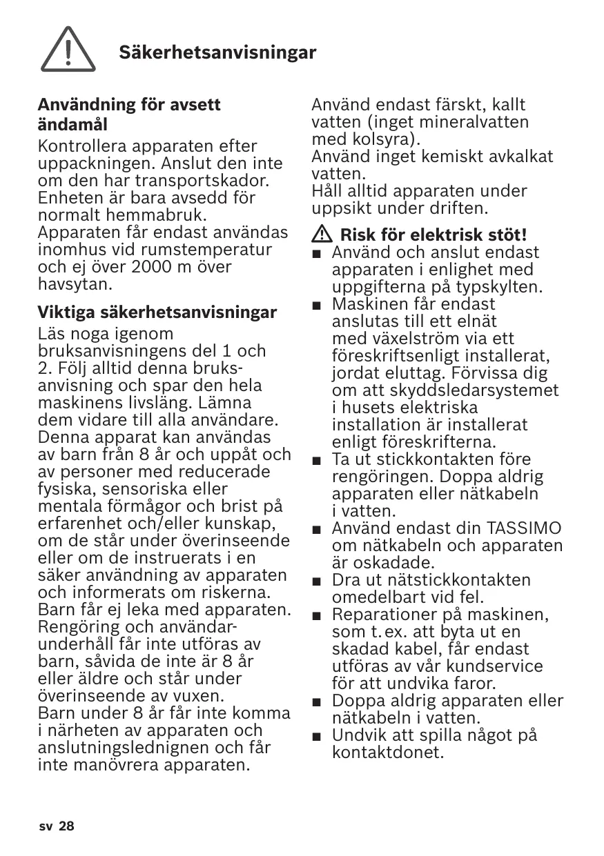 Använd endast färskt, kallt vatten (inget mineralvatten med kolsyra). Använd inget kemiskt avkalkat vatten. Håll alltid apparaten under uppsikt under driften. W Risk för elektrisk stöt! ■ Använd och anslut endast apparaten i enlighet med uppgifterna på typskylten. ■ Maskinen får endast anslutas till ett elnät med växelström via ett föreskriftsenligt installerat, jordat eluttag. Förvissa dig om att skyddsledarsystemet i husets elektriska installation är installerat enligt föreskrifterna. ■ Ta ut stickkontakten före rengöringen. Doppa aldrig apparaten eller nätkabeln i vatten. ■ Använd endast din TASSIMO om nätkabeln och apparaten är oskadade. ■ Dra ut nätstickkontakten omedelbart vid fel. ■ Reparationer på maskinen, som t. ex. att byta ut en skadad kabel, får endast utföras av vår kundservice för att undvika faror. ■ Doppa aldrig apparaten eller nätkabeln i vatten. ■ Undvik att spilla något på kontaktdonet.