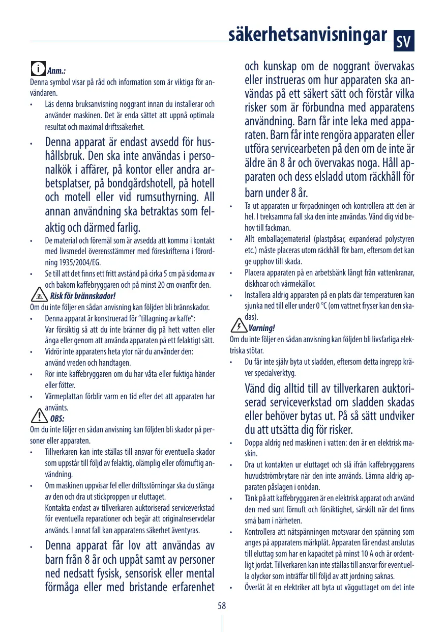 Les matières et les objets destinés au contact avec des produits alimentaires sont conformes au règlement européen 1935/2004. • Après avoir placé l’appareil sur le plan de travail, veillez à ce qu’il reste un espace d’environ 5 cm tout autour de la machine à café et de 20 cm au moins au-dessus. Danger Brûlures ! Risque de brûlures. • Cet appareil est fabriqué pour “faire du café”. Attention aux brûlures causées par les projections d’eau chaude ou de vapeur ou par une mauvaise utilisation de l’appareil. • Pendant l’utilisation ne touchez pas les surfaces chaudes de l’appareil. Ne touchez que les boutons ou les poignées. • Évitez de toucher l’appareil les mains ou les pieds mouillés ou humides. • La plaque chauffante reste chaude après l’utilisation de l’appareil. Attention ! Le non-respect de ces consignes peut provoquer des blessures ou endommager l’appareil. • Le fabricant ne peut être tenu pour responsable des dommages éventuellement causés par une mauvaise utilisation ou une utilisation non conforme aux instructions. • En cas de panne ou de mauvais fonctionnement de l’ap-