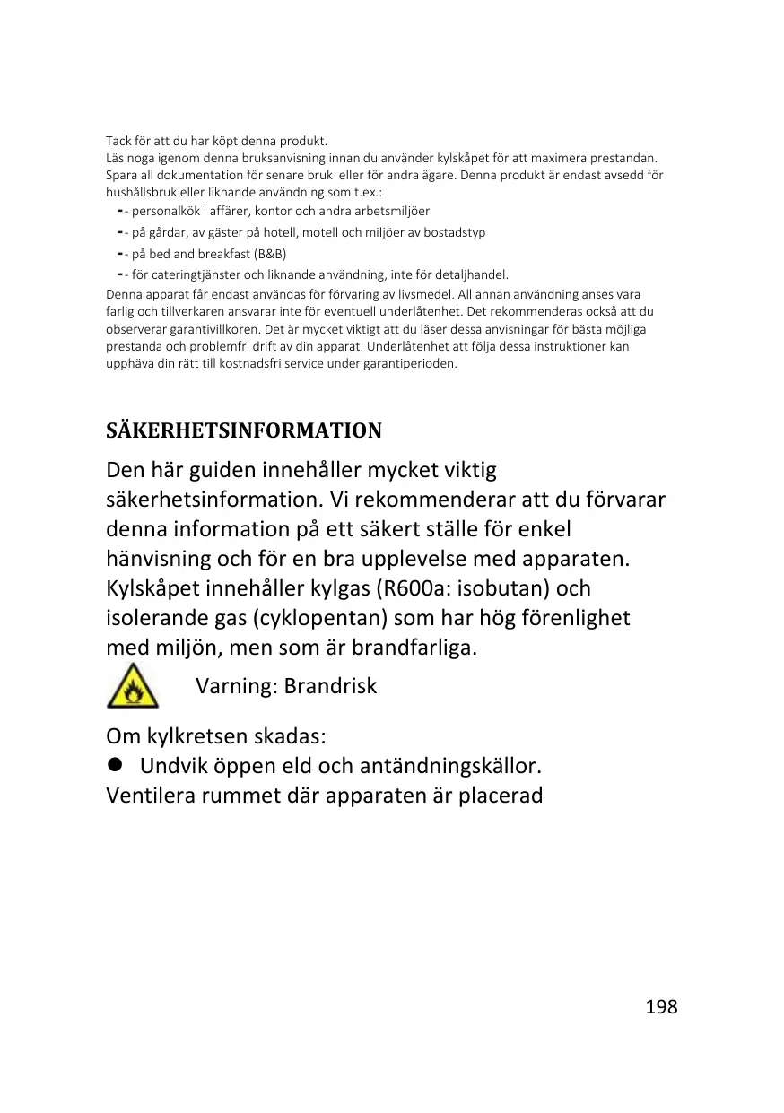 Ce réfrigérateur contient un gaz réfrigérant (R600a : isobutane) et un gaz isolant (cyclopentane), qui présentent une compatibilité élevée avec l'environnement mais des propriétés inflammables. Attention : risque d'incendie En cas de dommages du circuit de réfrigérant :  Éviter des flammes ouvertes et des sources d'inflammation. Bien aérer la pièce dans laquelle se trouve l'appareil. 46