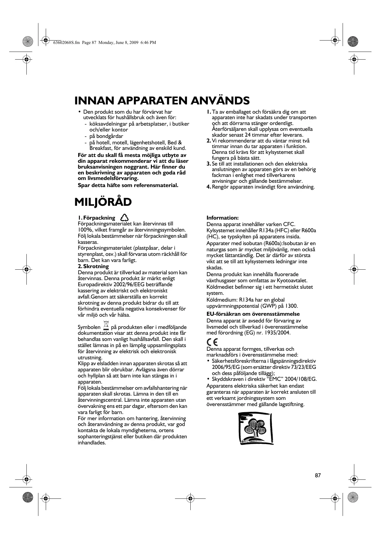 63602068S.fm Page 87 Monday, June 8, 2009 6:46 PM INNAN APPARATEN ANVÄNDS • Den produkt som du har förvärvat har utvecklats för hushållsbruk och även för: - köksavdelningar på arbetsplatser, i butiker och/eller kontor - på bondgårdar - på hotell, motell, lägenhetshotell, Bed & Breakfast, för användning av enskild kund. För att du skall få mesta möjliga utbyte av din apparat rekommenderar vi att du läser bruksanvisningen noggrant. Här finner du en beskrivning av apparaten och goda råd om livsmedelsförvaring. Spar detta häfte som referensmaterial.