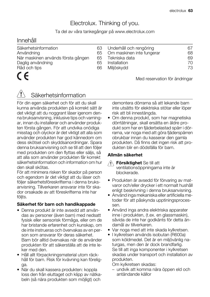 demontera dörrarna så att lekande barn inte utsätts för elektriska stötar eller löper risk att bli innestängda. • Om denna produkt, som har magnetiska dörrtätningar, skall ersätta en äldre produkt som har en fjäderbelastad spärr i dörrarna, var noga med att göra fjäderspärren obrukbar innan du kasserar den gamla produkten. Då finns det ingen risk att produkten blir en dödsfälla för barn. Allmän säkerhet Försiktighet Se till att ventilationsöppningarna inte är blockerade. • Produkten är avsedd för förvaring av matvaror och/eller drycker i ett normalt hushåll enligt beskrivning i denna bruksanvisning. • Använd inga mekaniska eller artificiella metoder för att påskynda upptiningsprocessen. • Använd inga andra elektriska apparater inne i produkten, (t.ex. en glassmaskin), såvida de inte har godkänts för detta ändamål av tillverkaren. • Var noga med att inte skada kylkretsen. • I kylkretsen används isobutan (R600a) som köldmedel. Det är en miljövänlig naturgas, men den är dock brandfarlig. Se till att inga komponenter i kylkretsen skadas under transport och installation av produkten. Om kylkretsen skadas: – undvik att komma nära öppen eld och antändande källor